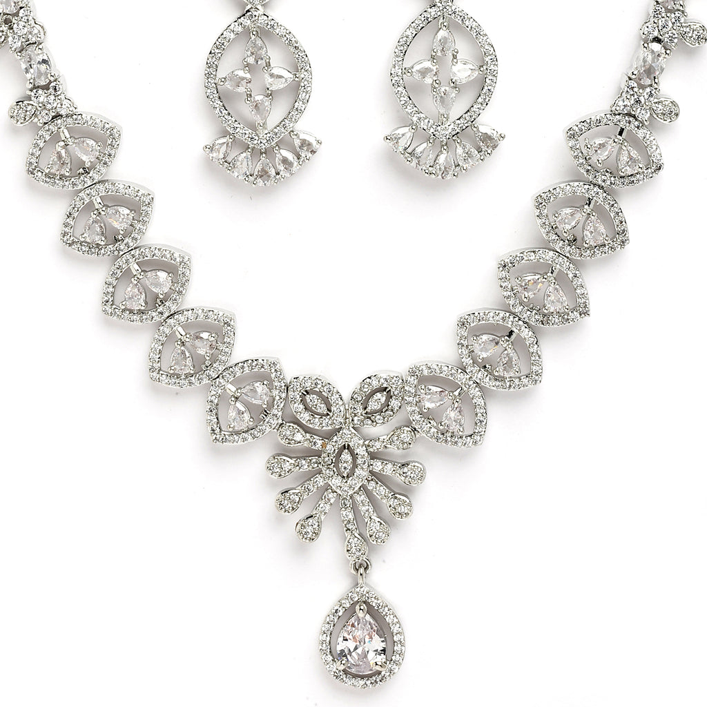 Elegant Ladymania Design: This rhodium-plated necklace and earrings set features a unique Ladymania-inspired design, beautifully studded with shimmering AD stones for a sophisticated look.