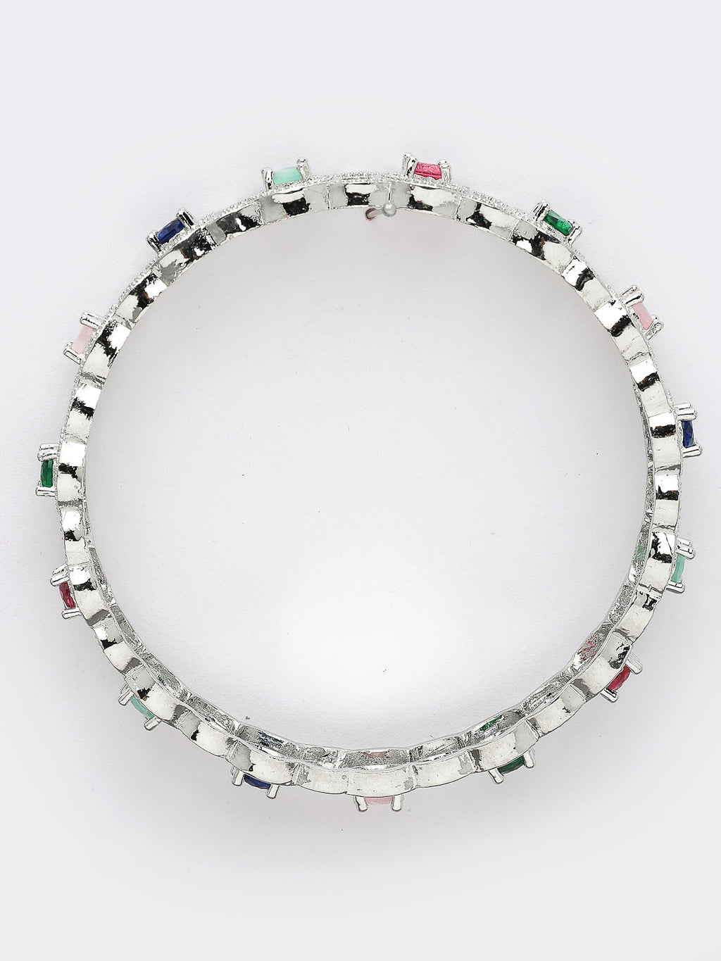 Stunning Circular Design: These rhodium-plated kada bangles feature a unique circular design, studded with multicolor American diamonds, creating a vibrant and eye-catching look.