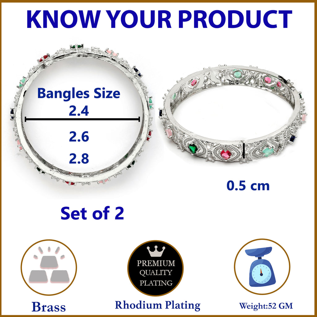Vibrant & Bold Design: These rhodium-plated kada bangles feature multicolor American diamonds, creating a striking and colorful design that adds a bold touch to your outfit.