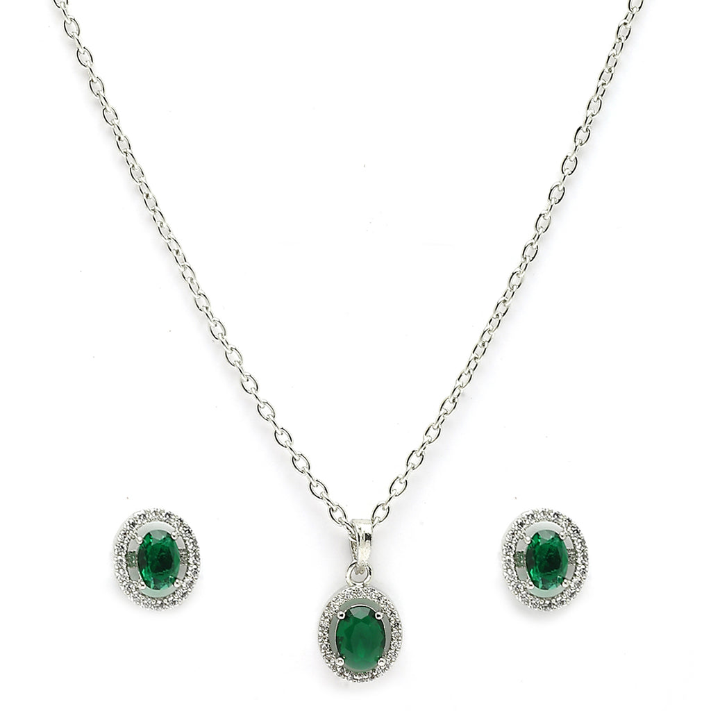 Graceful Oval Design: This rhodium-plated pendant set features an elegant oval shape, adorned with a vibrant green American diamond, adding a sophisticated touch to your style.