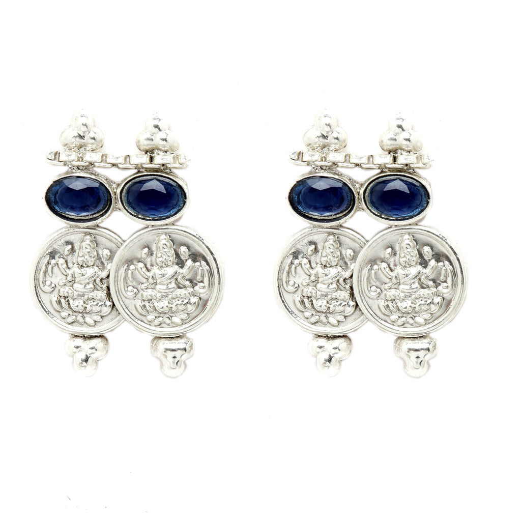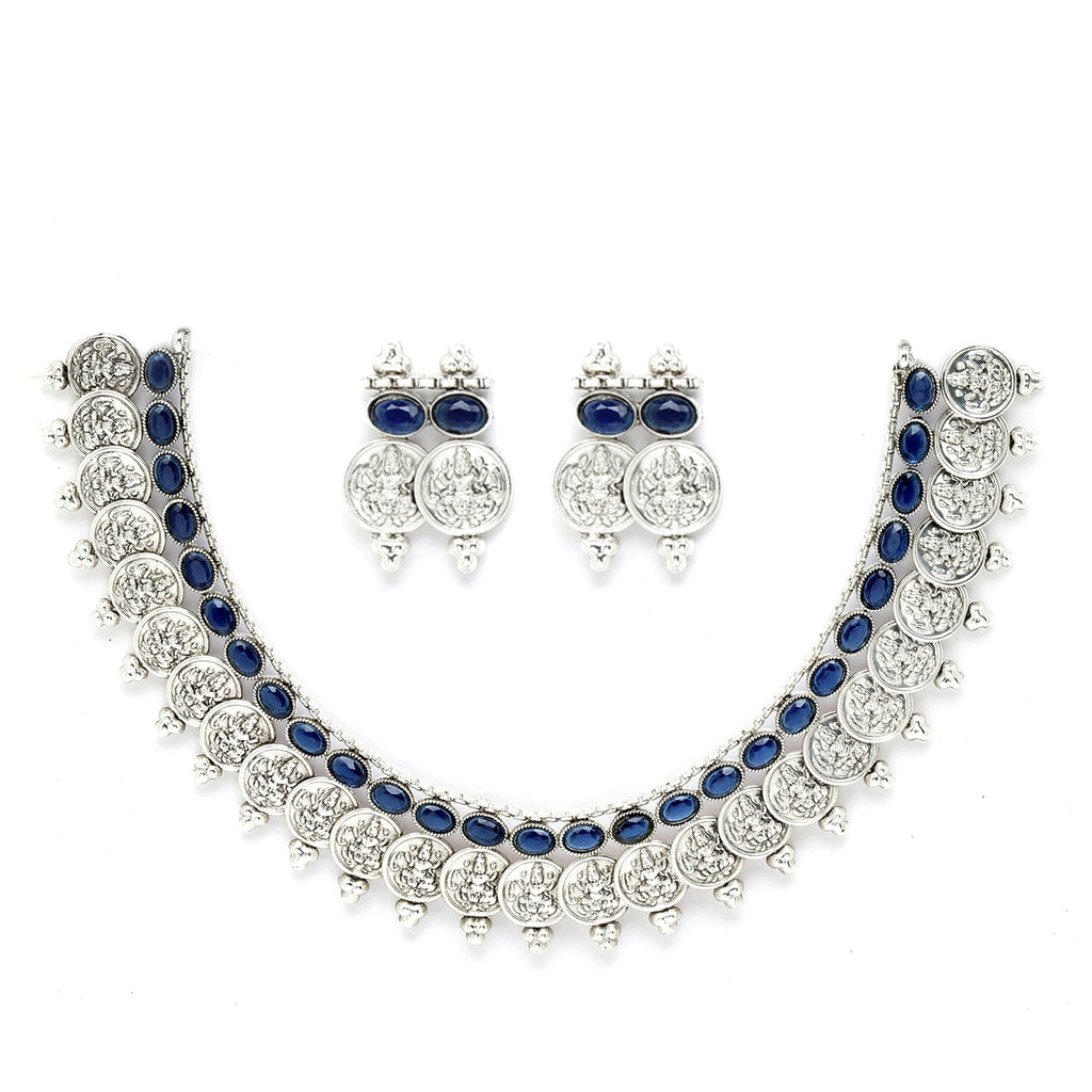 Rhodium-Plated with Oxidised Silver-Plated Navy Blue Artificial Beads Studded & Temple Coin Jewellery Set