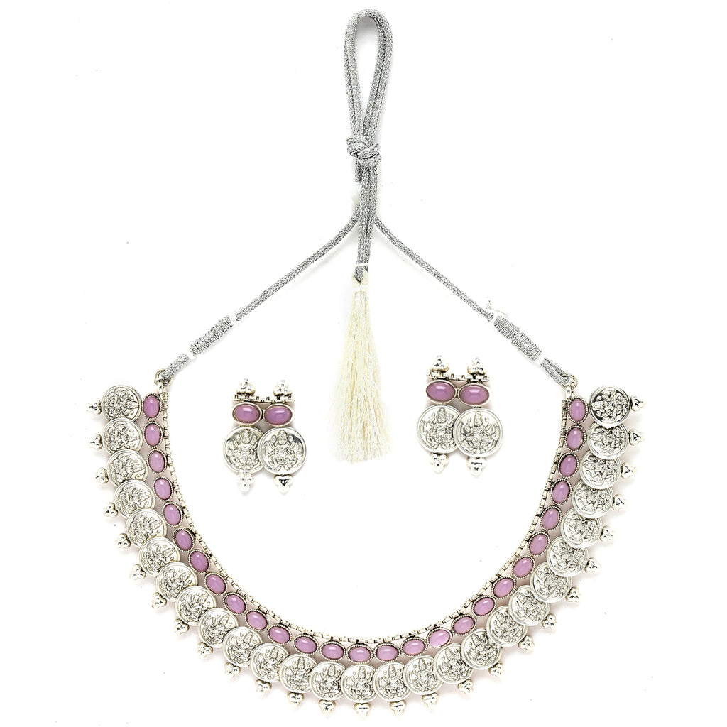 Rhodium-Plated with Oxidised Silver-Plated Pink Artificial Beads Studded & Temple Coin Jewellery Set
