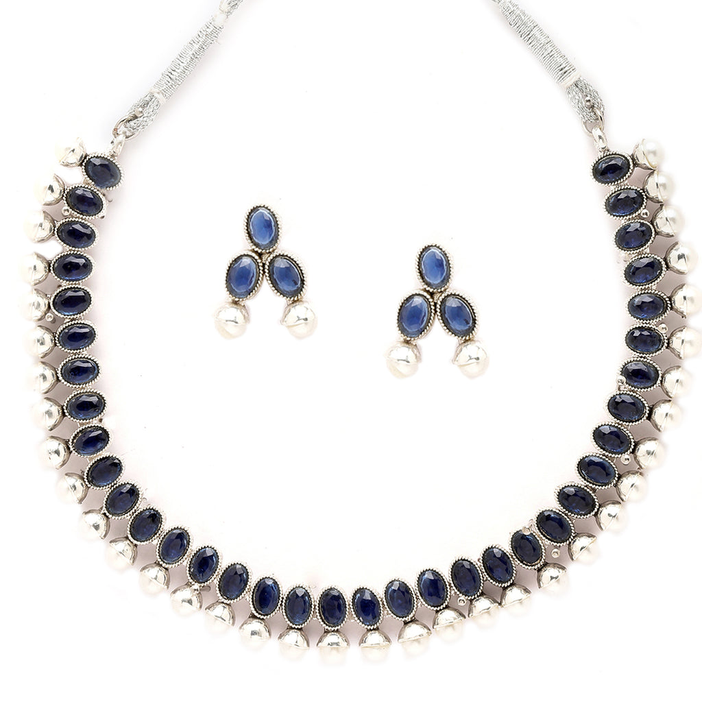 This jewellery set consists of a necklace and earrings. Rhodium-Plated with Oxidized Silver-Toned Navy Blue Cubic Zirconia studded and White Pearl beaded necklace, secured with a Drawstring closure. A pair of matching earrings each secured with post back closure.
