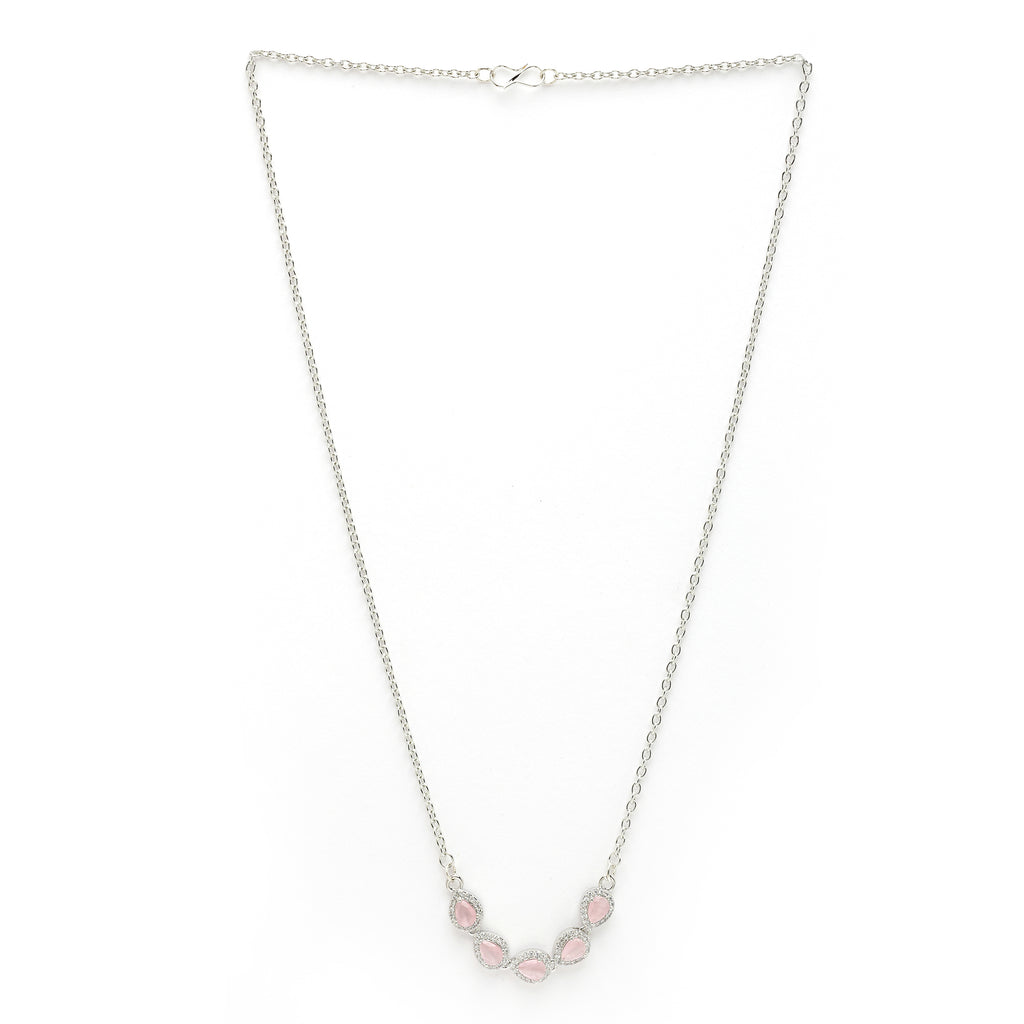 Elegant Design: Rhodium-plated pendant set featuring a classy tear-drop shape adorned with sparkling pink & White American diamonds for a refined look.