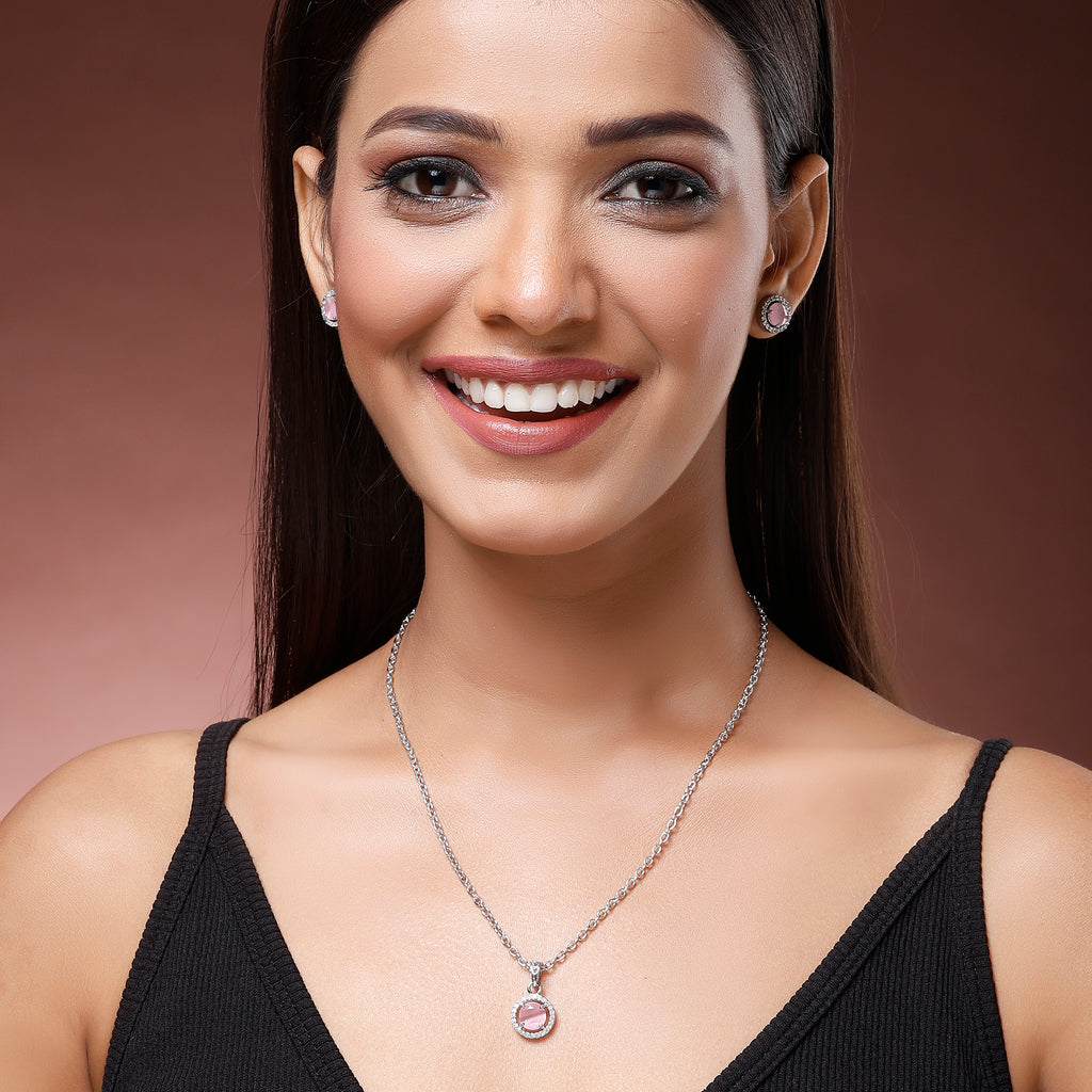 Chic Round Design: This rhodium-plated pendant set features a sleek circular design, enhanced with a stunning pink American diamond for a touch of modern elegance.