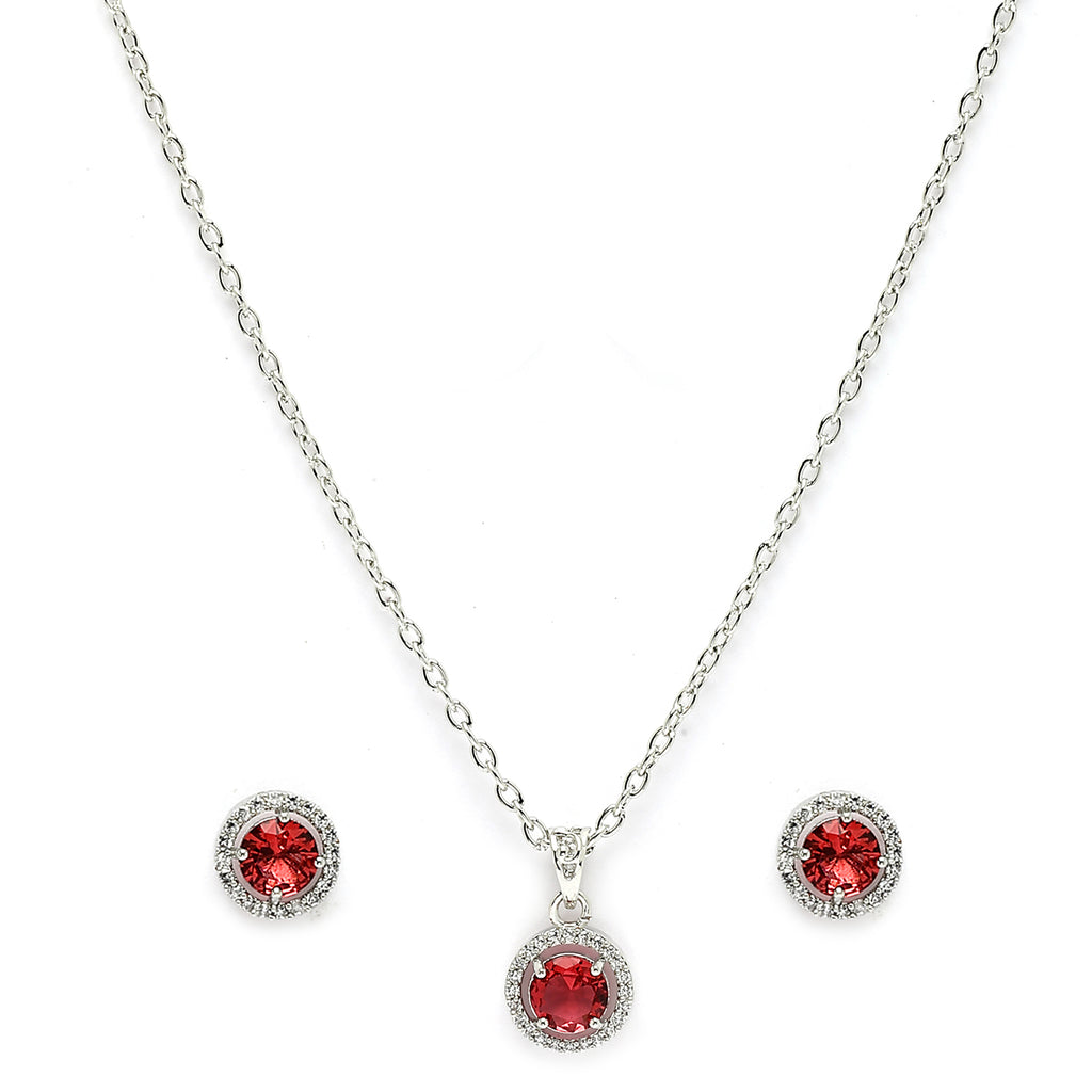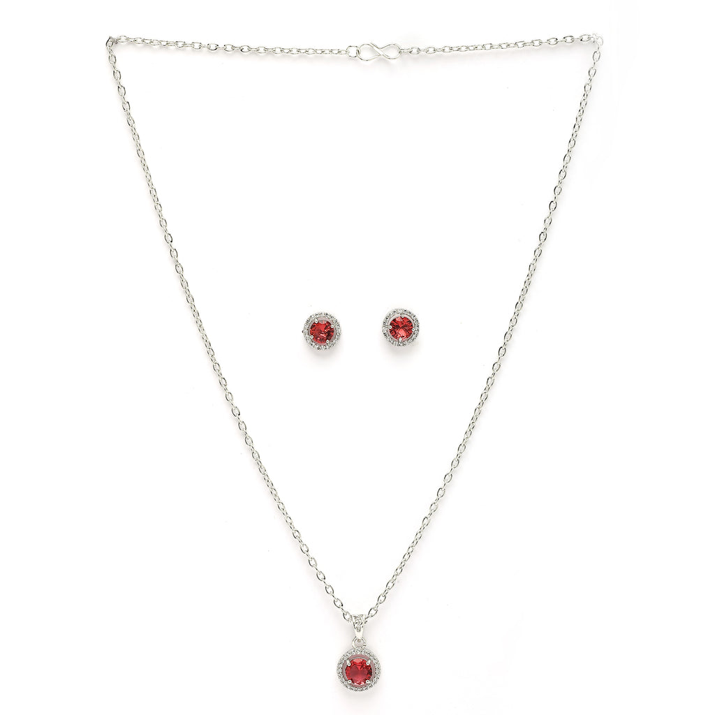 Chic Round Design: This rhodium-plated pendant set features a sleek circular design, enhanced with a stunning red American diamond for a touch of modern elegance.