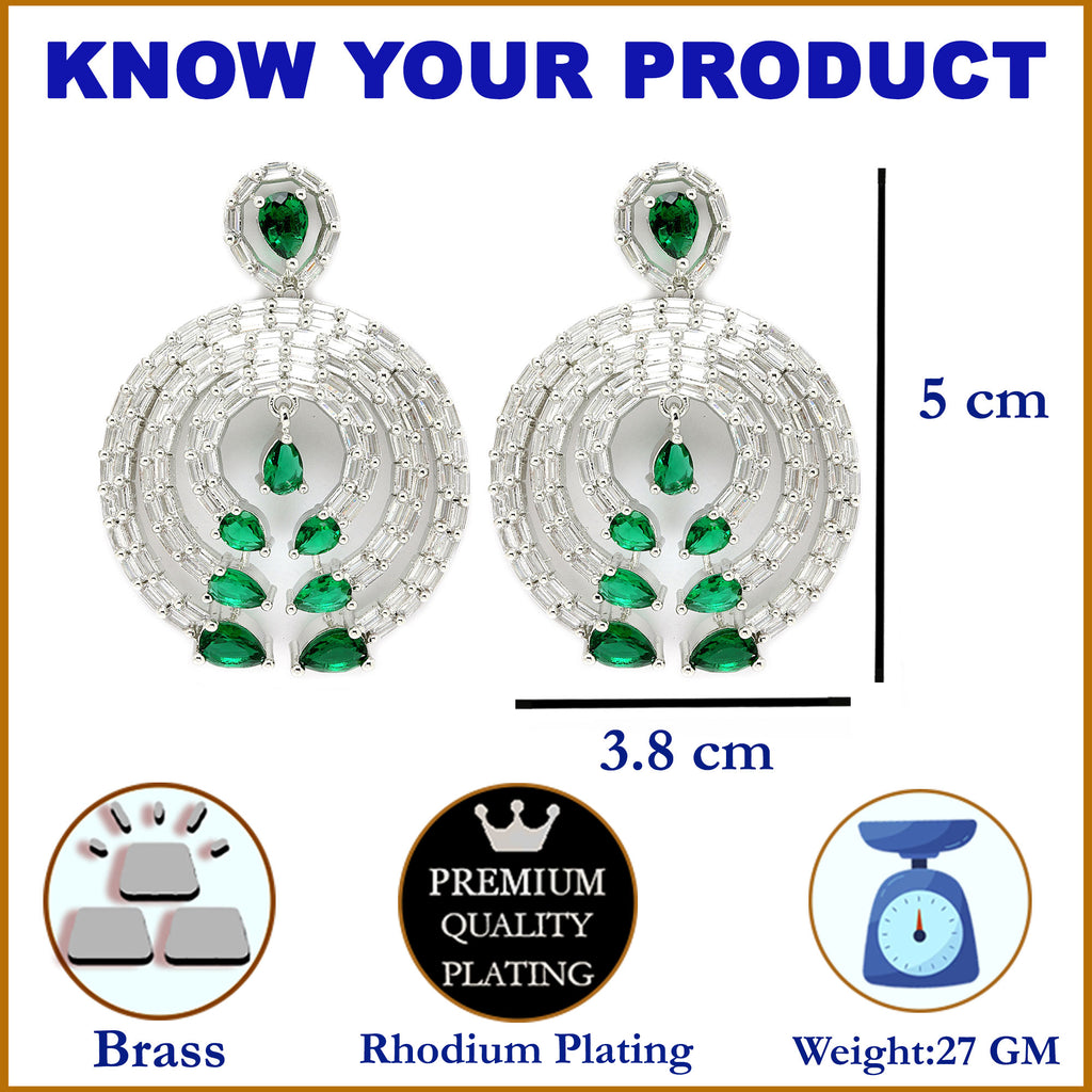 Rhodium-Plated with Silver-Tone Green & White American Diamond Studded Circular Contemporary Drop Earrings