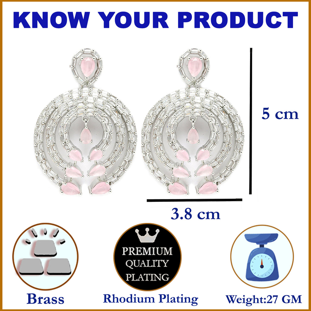 Rhodium-Plated with Silver-Tone Pink & White American Diamond Studded Circular Contemporary Drop Earrings