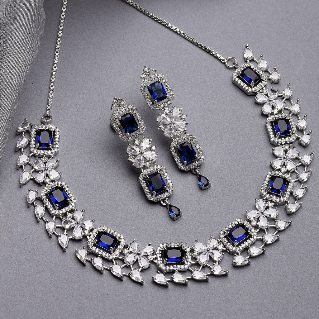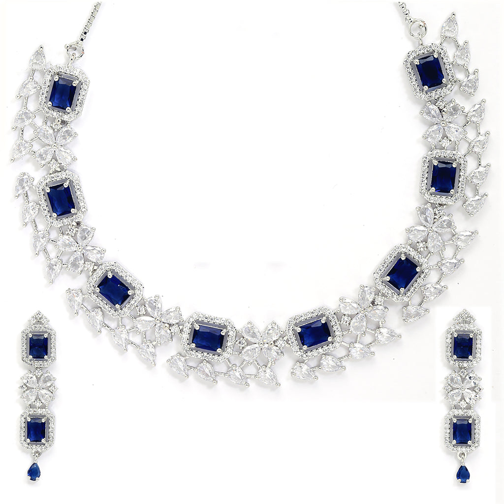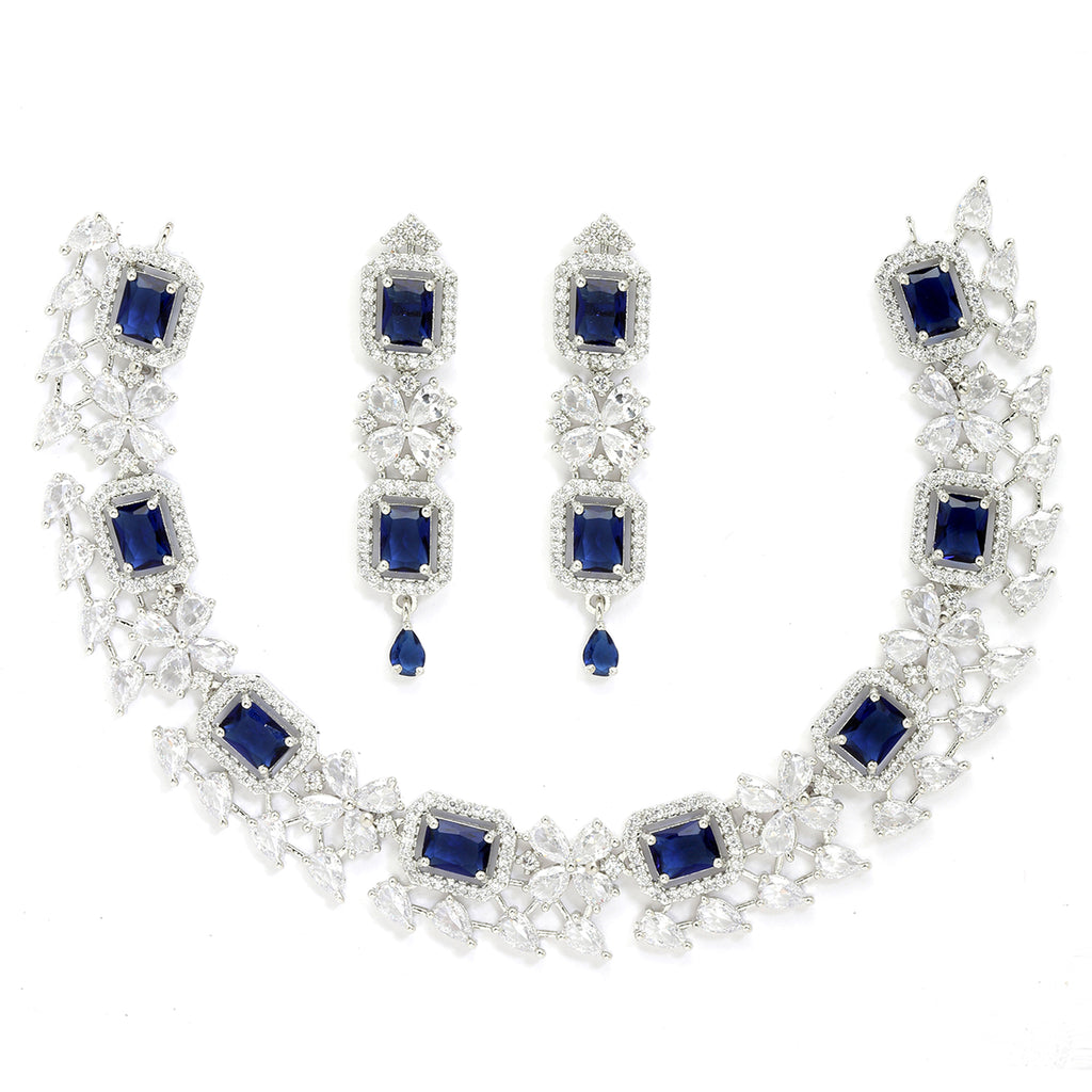 Rhodium-Plated with Silver-Toned Navy Blue and White American Diamond Studded Necklace and Earrings Jewellery Set