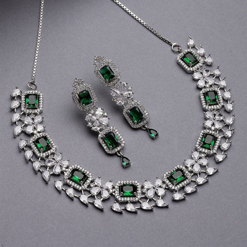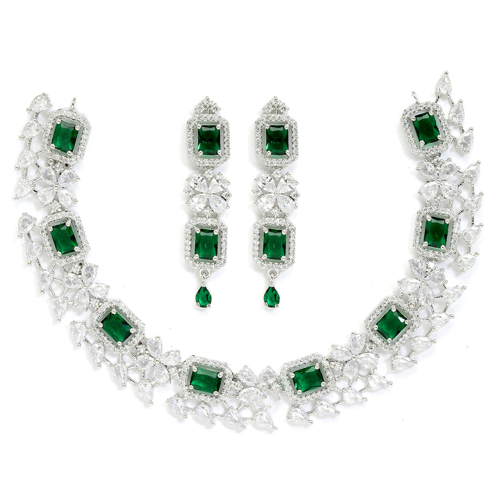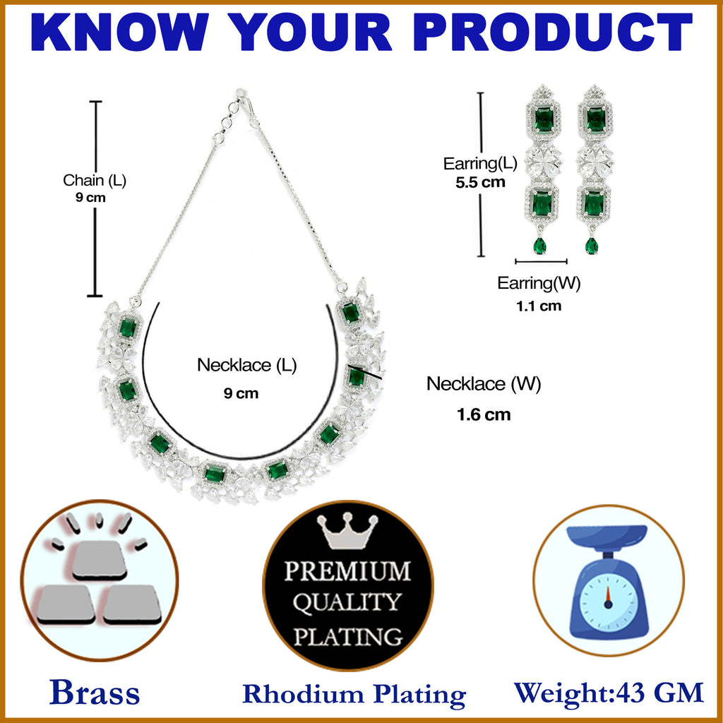 Rhodium-Plated with Silver-Toned Green and White American Diamond Studded Necklace and Earrings Jewellery Set