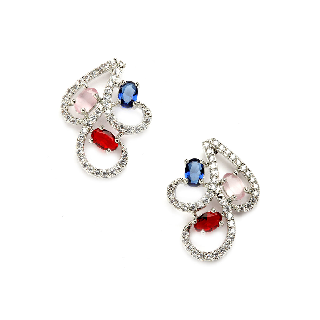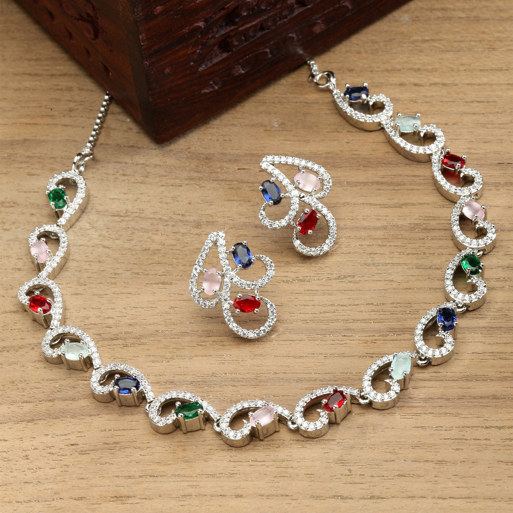 Rhodium-Plated with Silver-Toned Multi-Colour Cubic Zirconia & American Diamond studded Necklace and Drop Earrings Jewellery Set