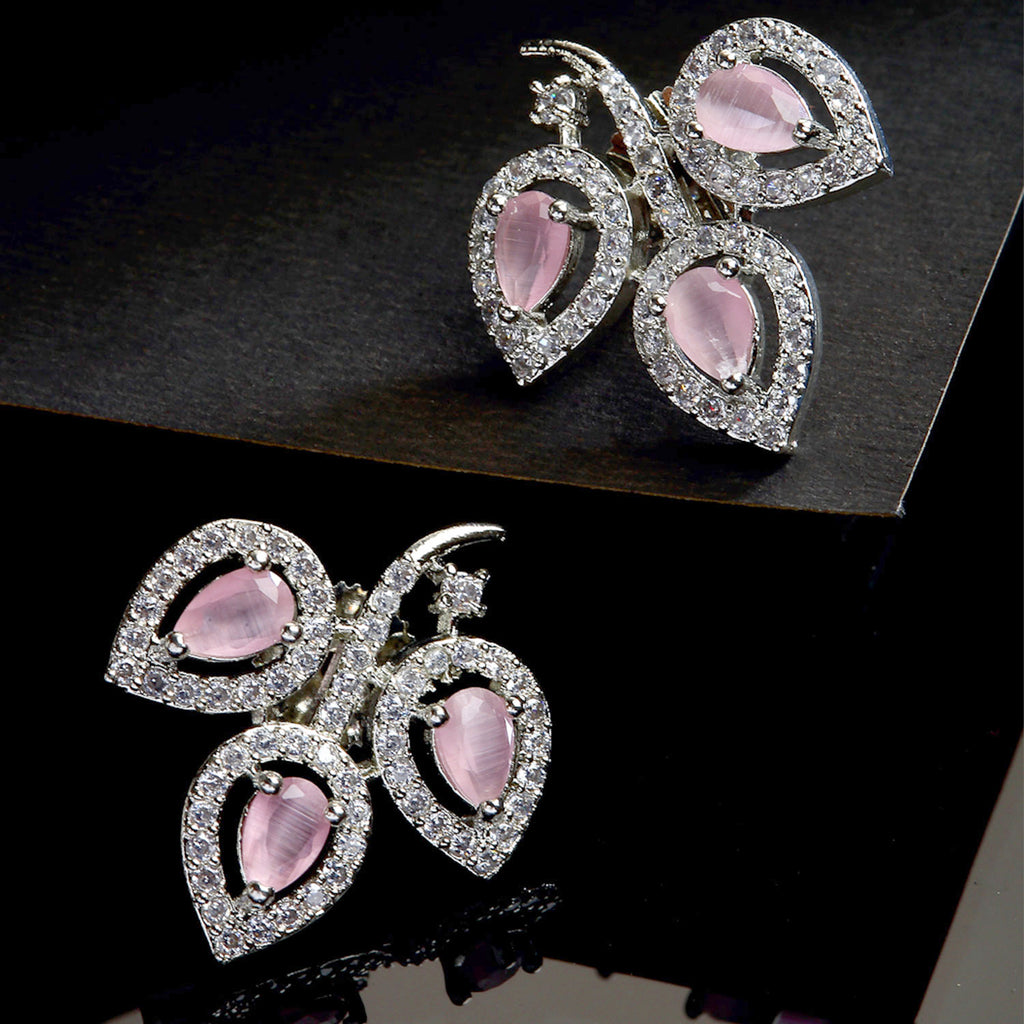 Rhodium-Plated with Silver-Toned Pink American Diamond Leaf Shaped Studs Earrings