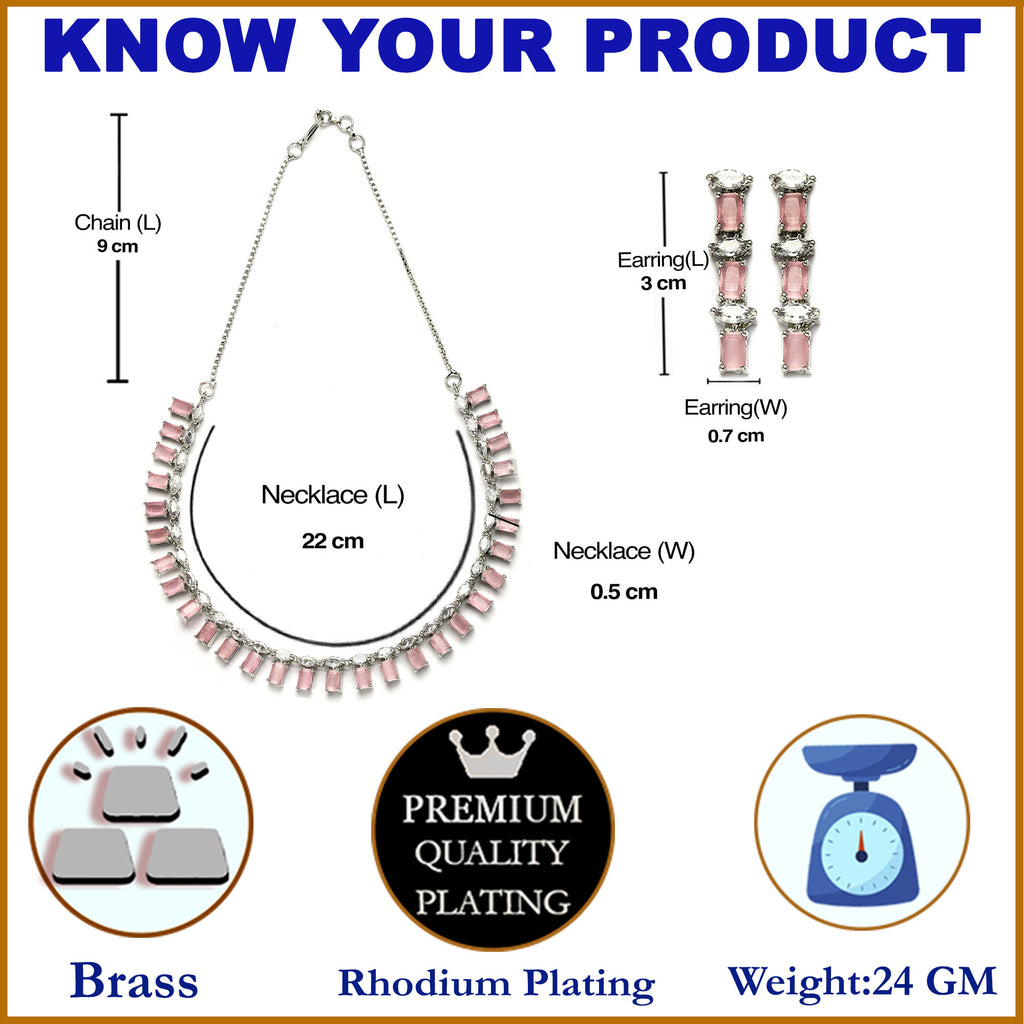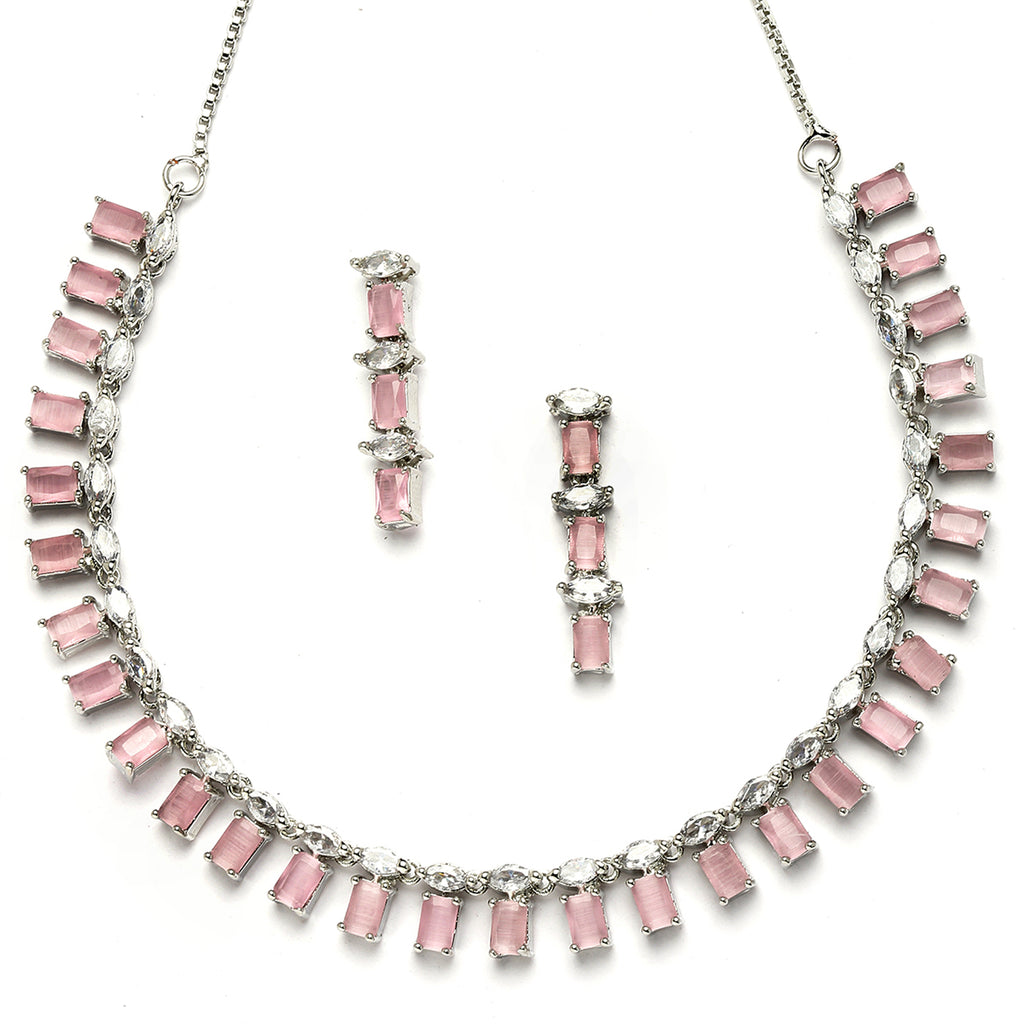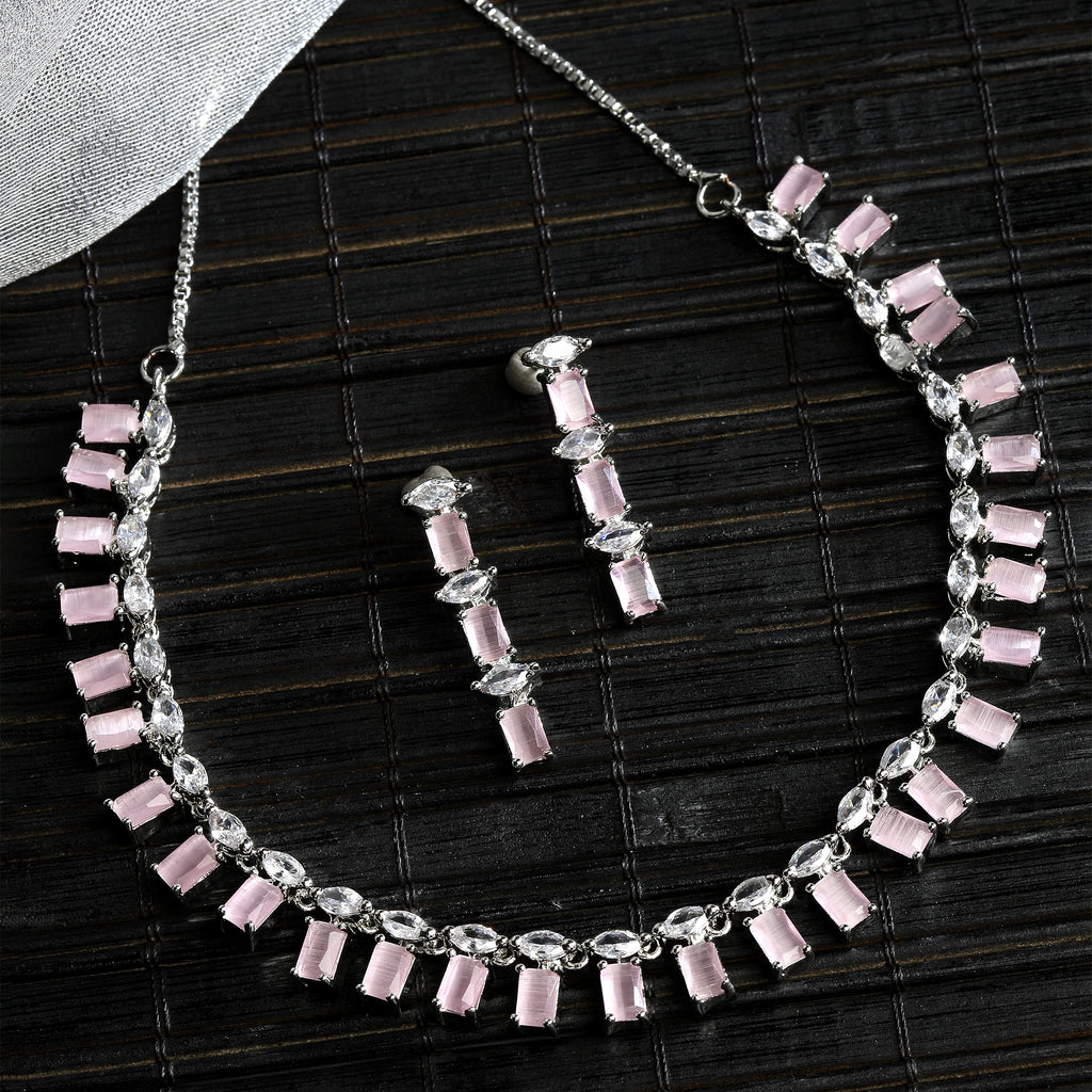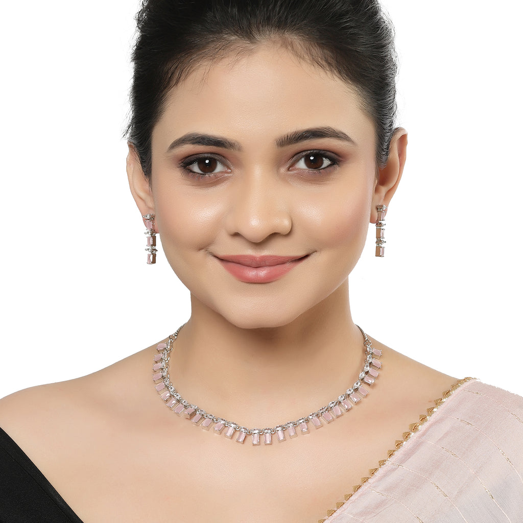 Rhodium-Plated with Silver-Toned Pink American Diamond Studded Jewellery Set