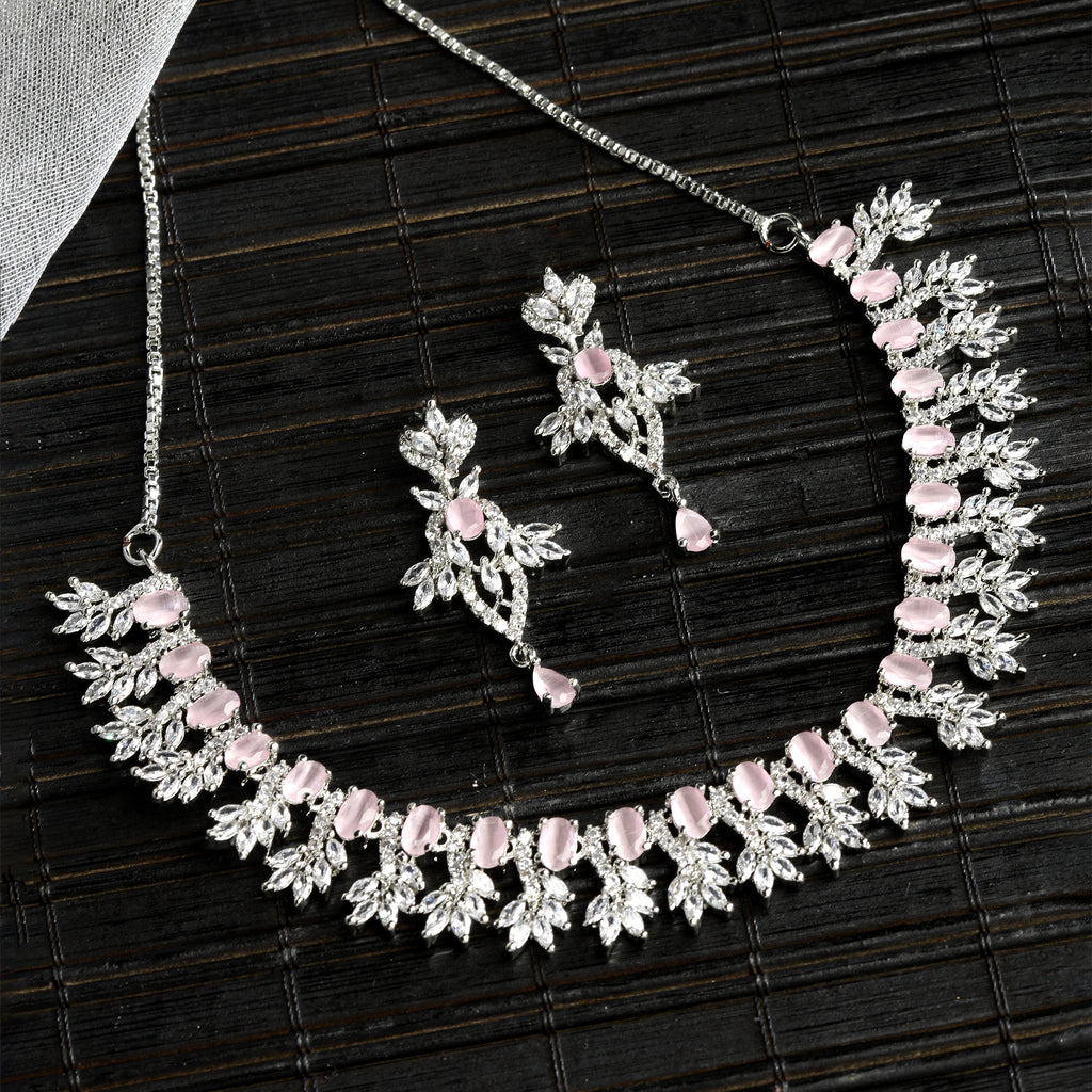 This jewellery set consists of a necklace & a pair of earrings. Rhodium-Plated Silver-Toned Brass Necklace has Pink and White American Diamond Stone Studded Embellish detail, secured with a Hook closure. A pair of matching drop earrings each secured with a post & back closure.