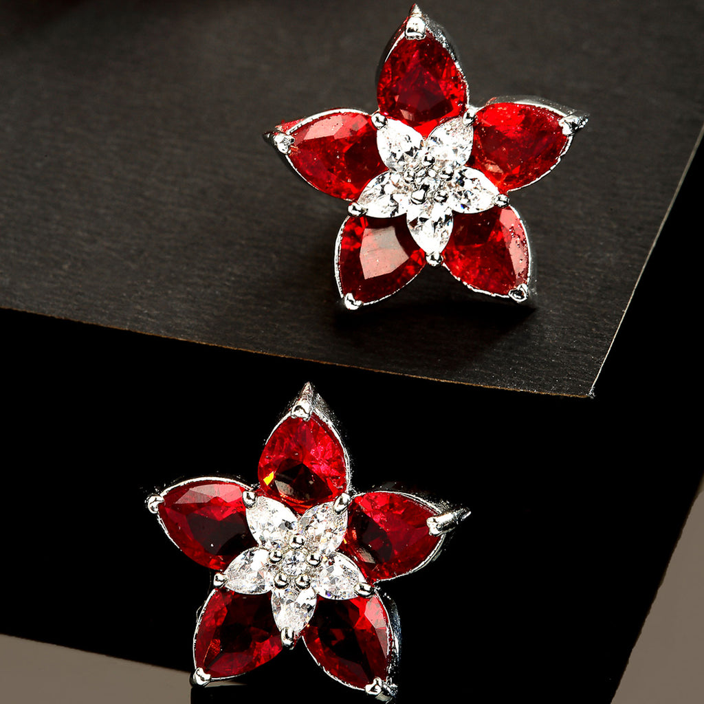 Rhodium-Plated with Silver-Toned Red American Diamond Floral Studs Earrings