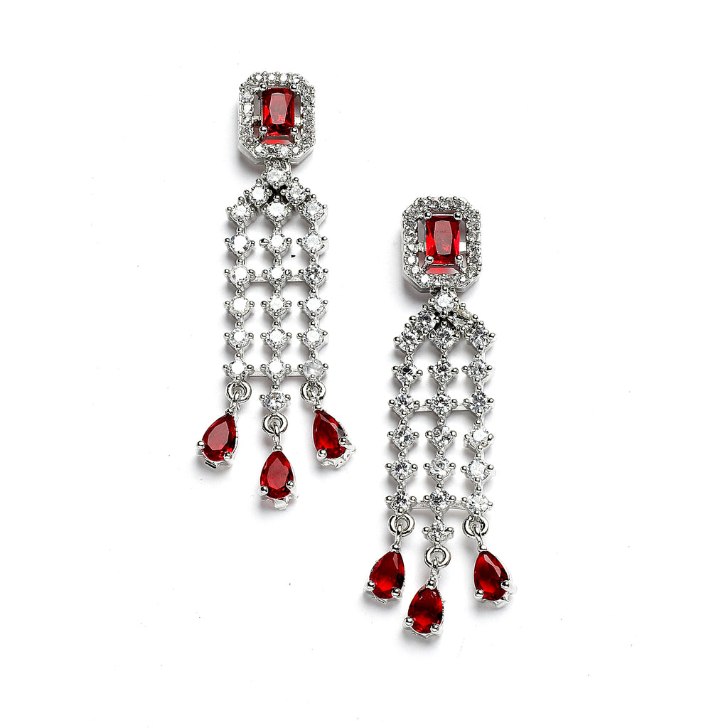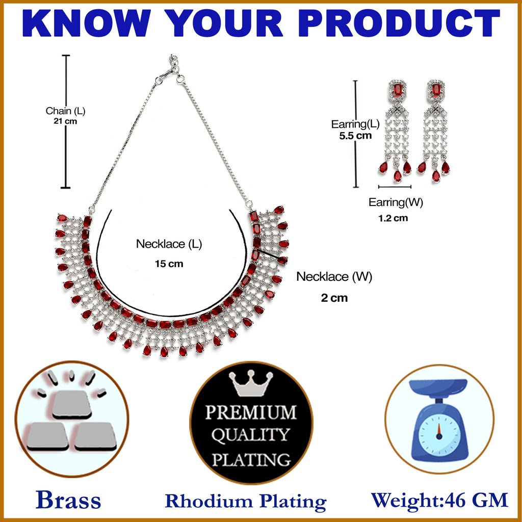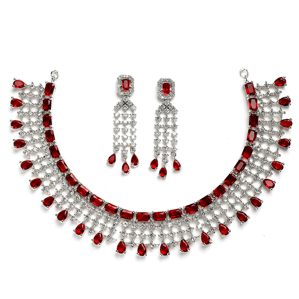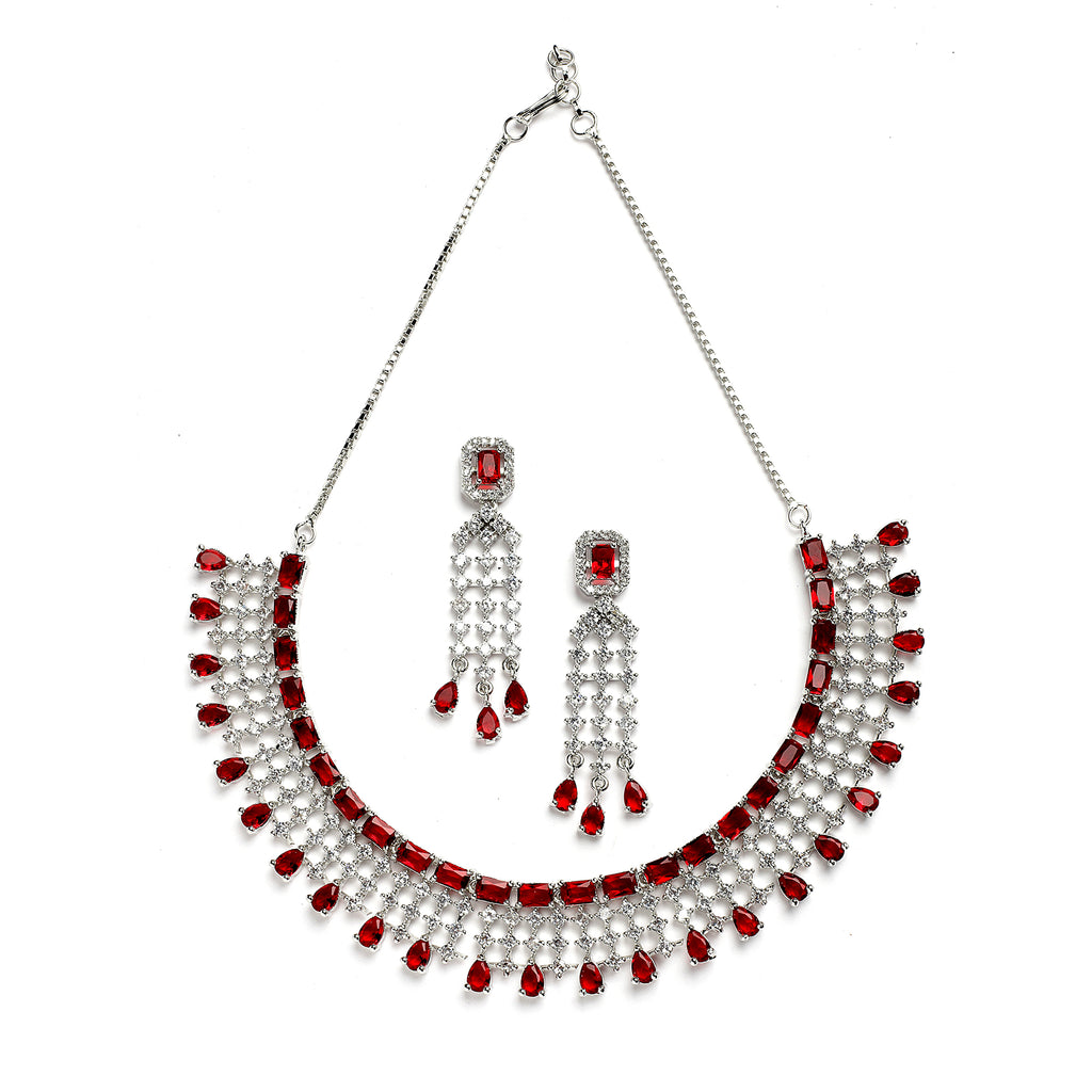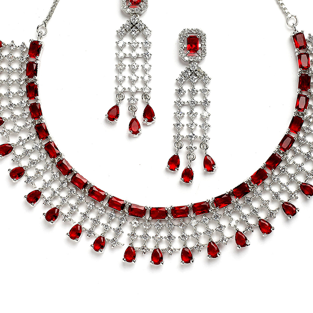 Rhodium-Plated with Silver-Toned Red American Diamond Studded Jewellery Set