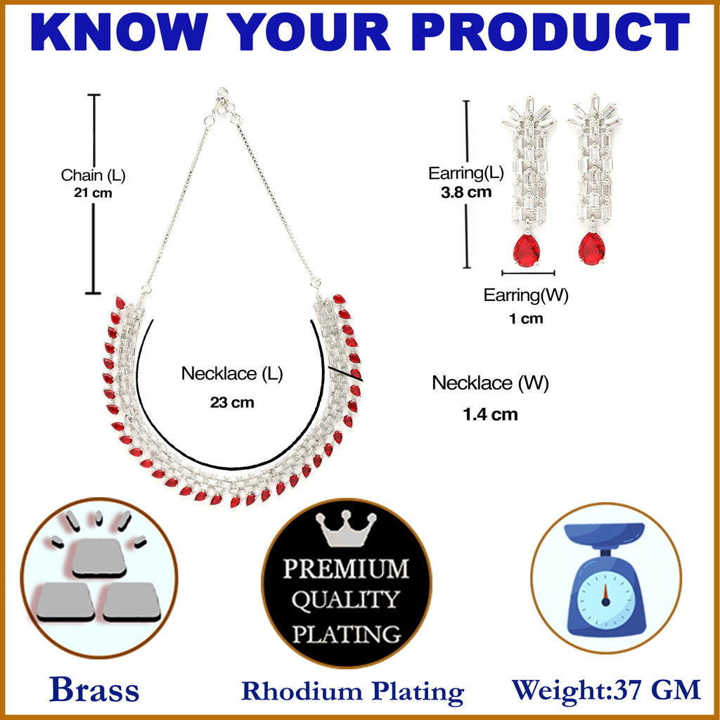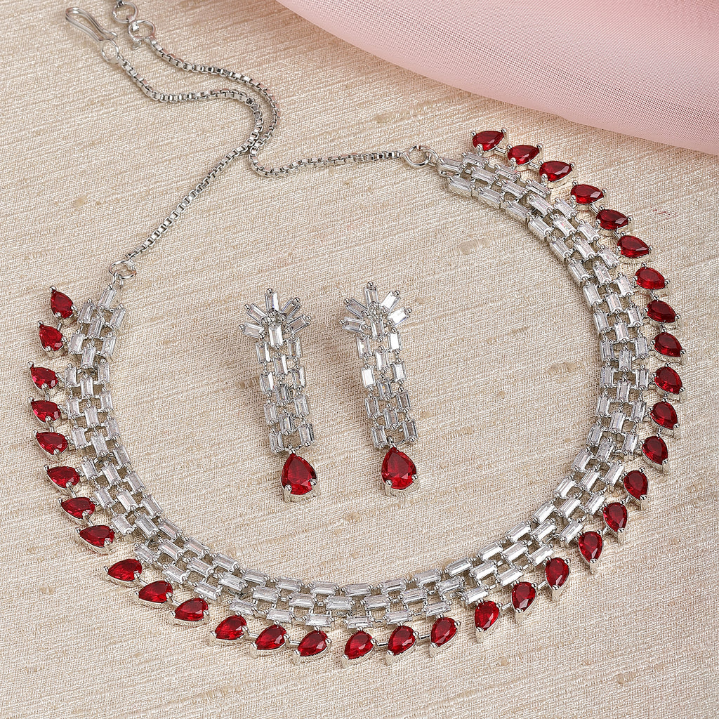 Rhodium-Plated with Silver-Toned Red and White American Diamond Studded Necklace & Earrings Jewellery Set