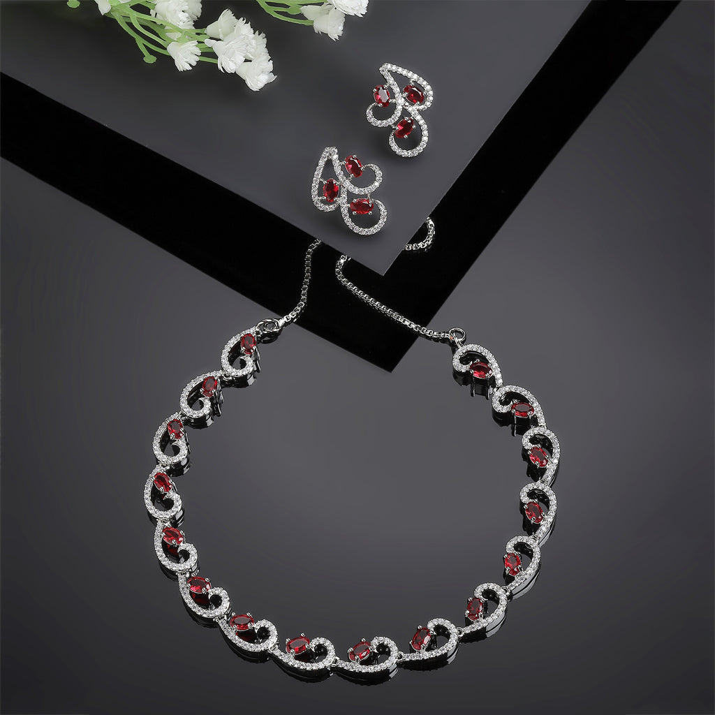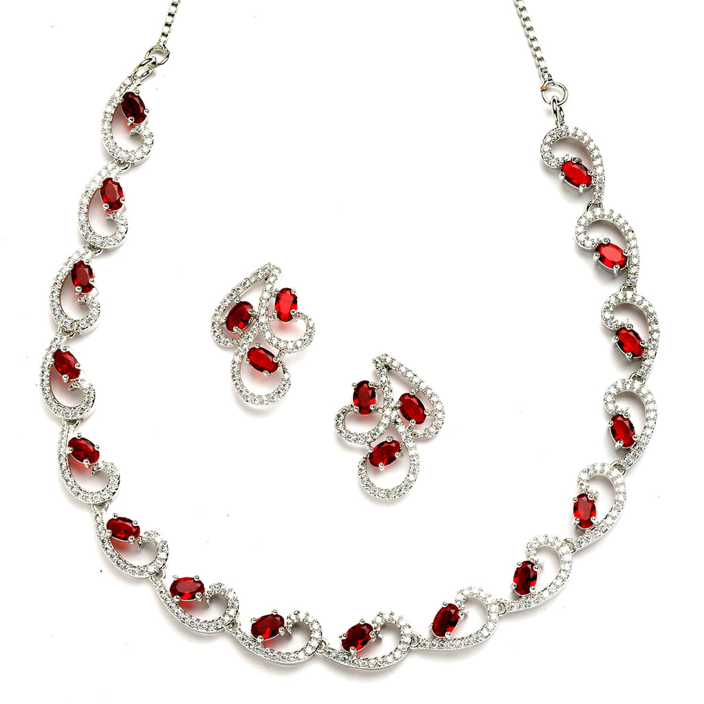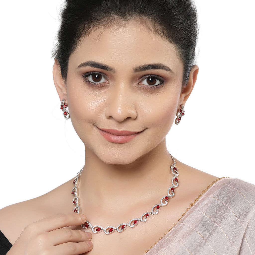 Rhodium-Plated with Silver-Toned Red and White Cubic Zirconia & American Diamond studded Necklace and Drop Earrings Jewellery Set