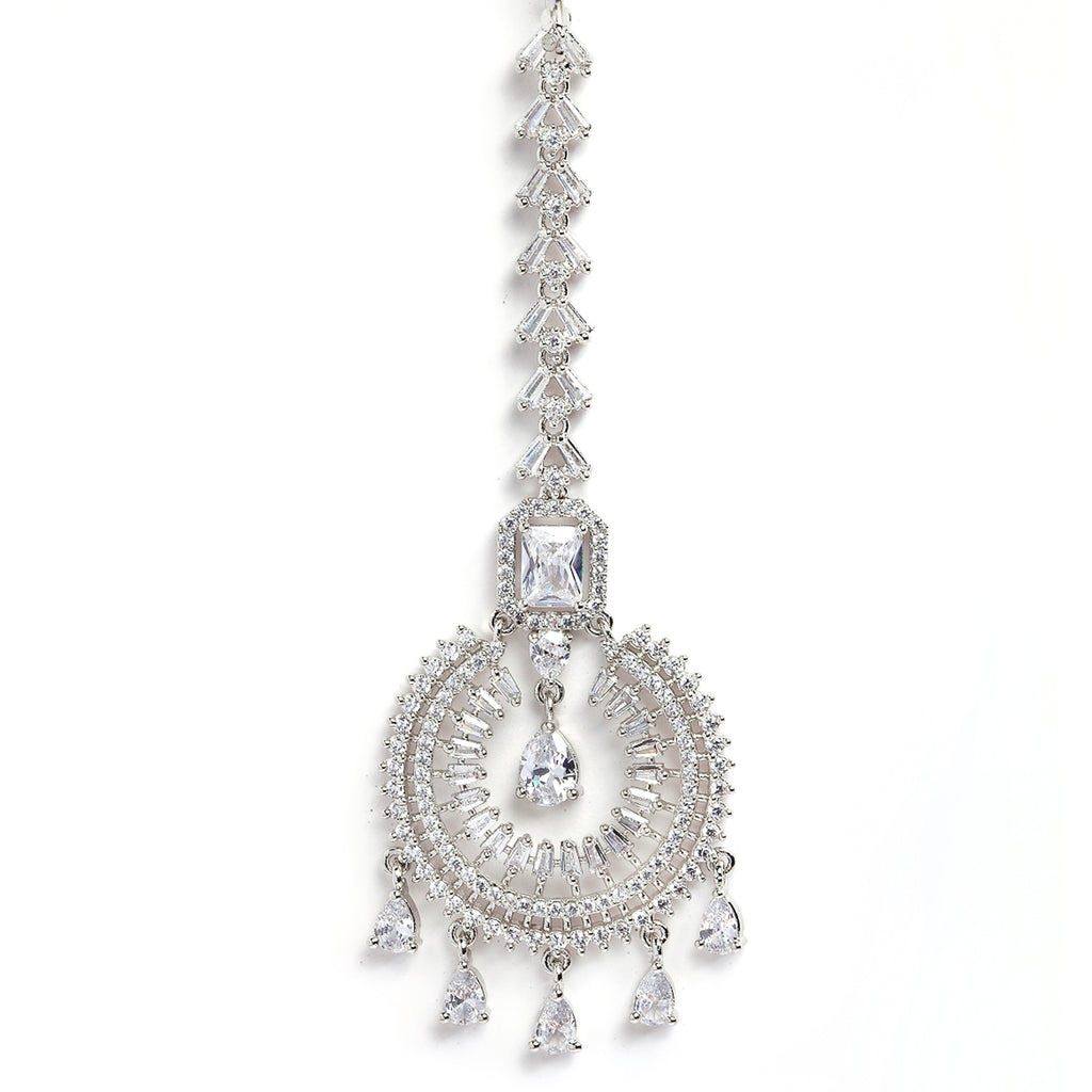 Rhodium-Plated with Silver-Toned Round Shape White American Diamond-Studded Maang Tikka & Earrings Set