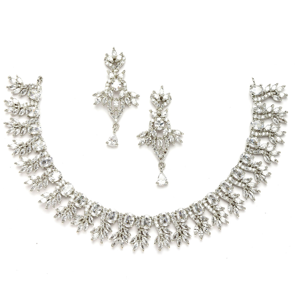 Rhodium-Plated with Silver-Toned White American Diamond Studded Embellish Statement Jewellery Set