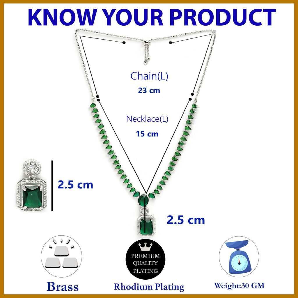 Unique and Elegant Design: This rhodium-plated necklace set features a distinctive pattern adorned with dazzling green American diamonds, exuding elegance and charm.
