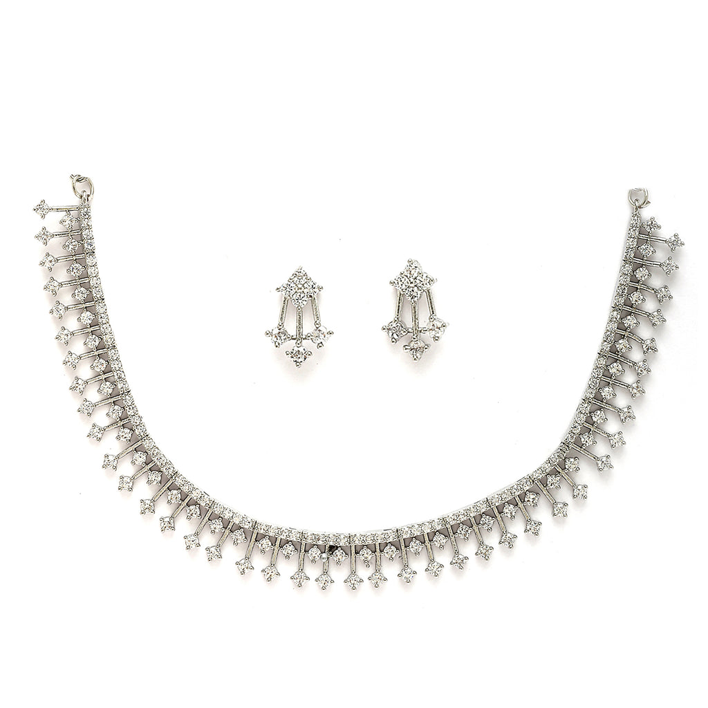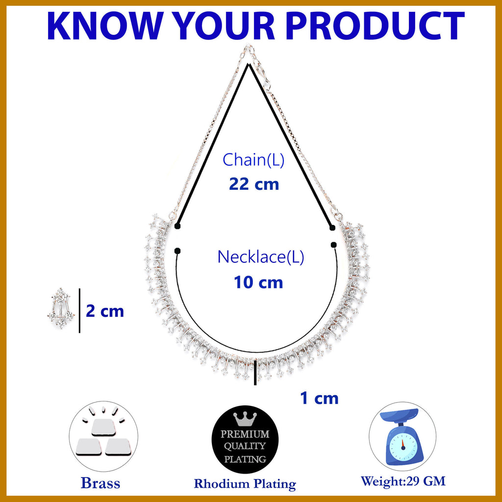 Unique and Elegant Design: Rhodium-plated necklace set with a distinctive, eye-catching design, studded with white American Diamond stones for a luxurious and timeless appeal.