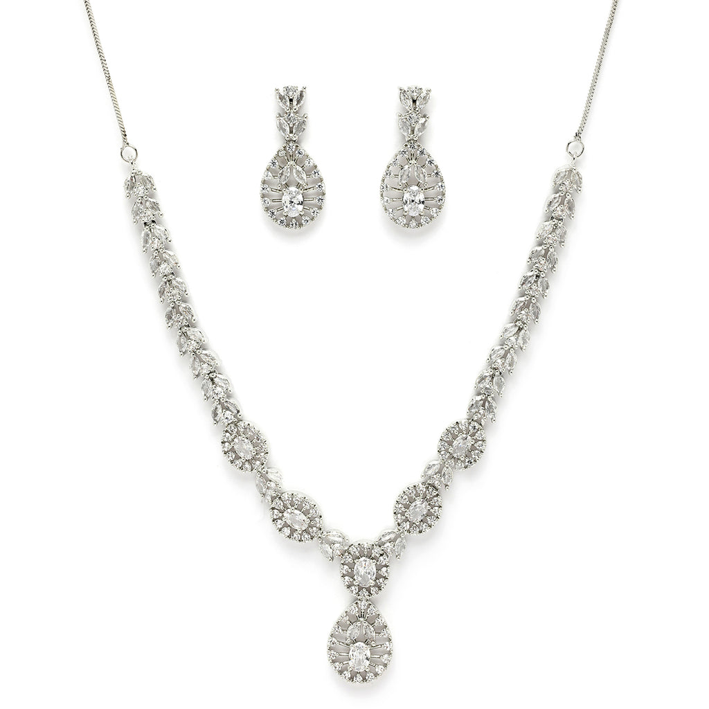 Elegant Design: Rhodium-plated necklace set featuring a stunning floral drop design, adorned with sparkling white American diamonds.