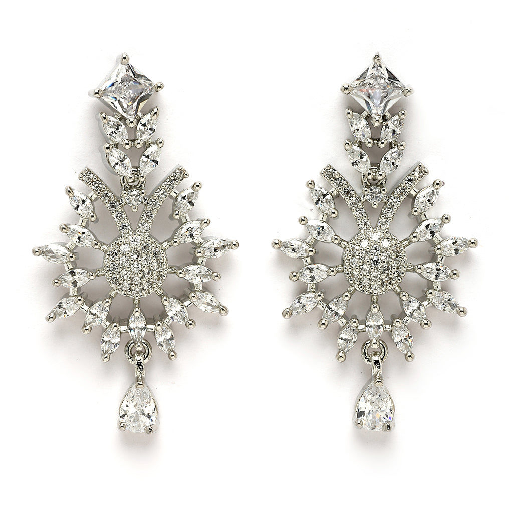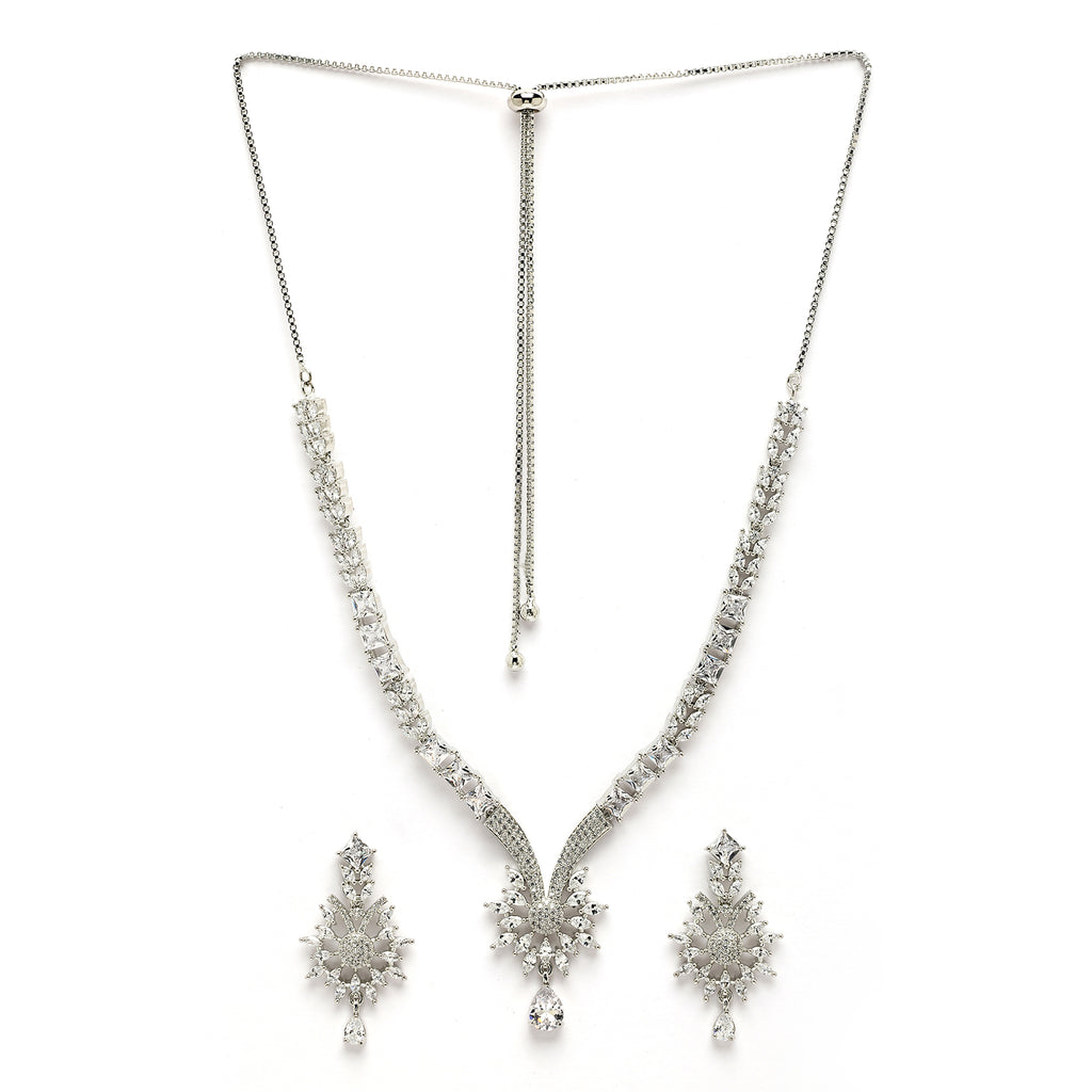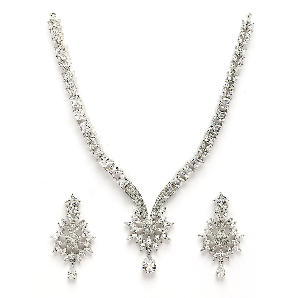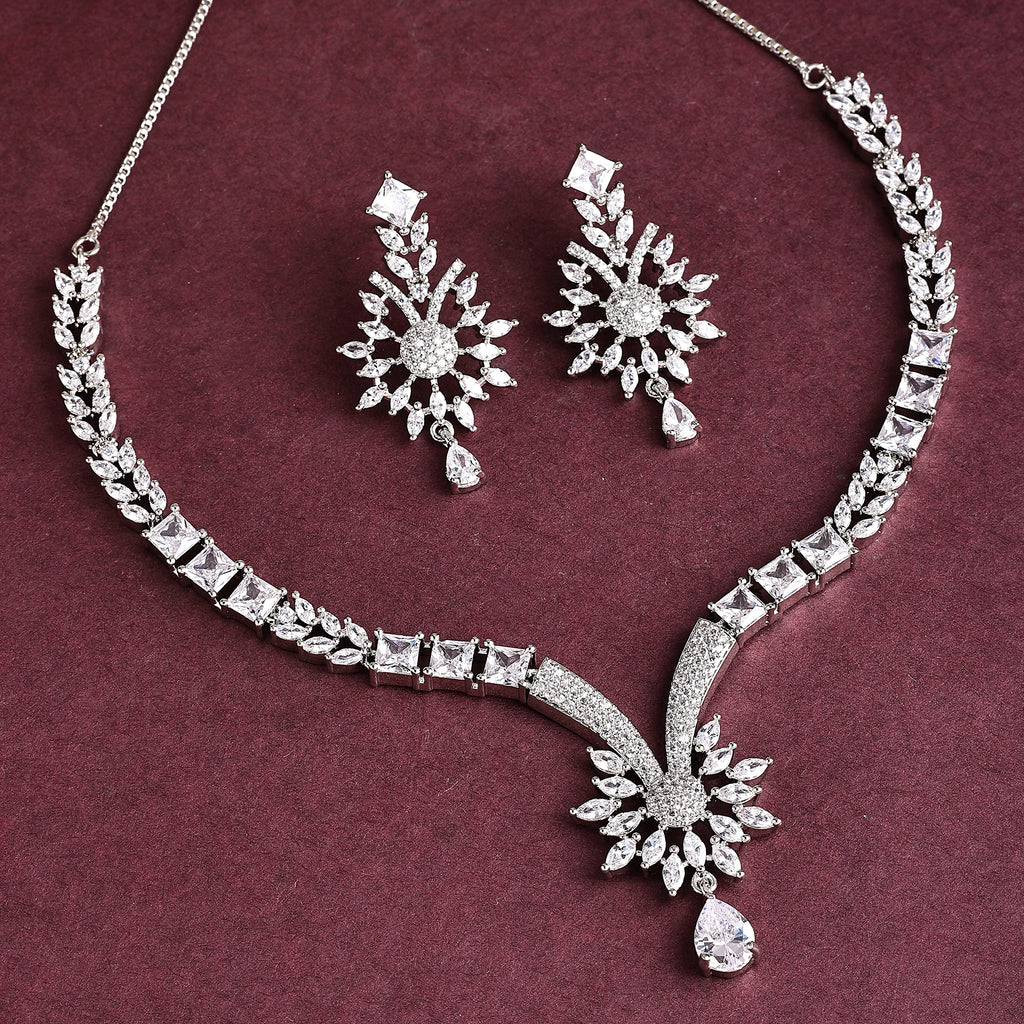 Elegant Floral Design: This rhodium-plated necklace set features a beautiful blend of floral and curved patterns adorned with sparkling white American diamonds for a timeless look.