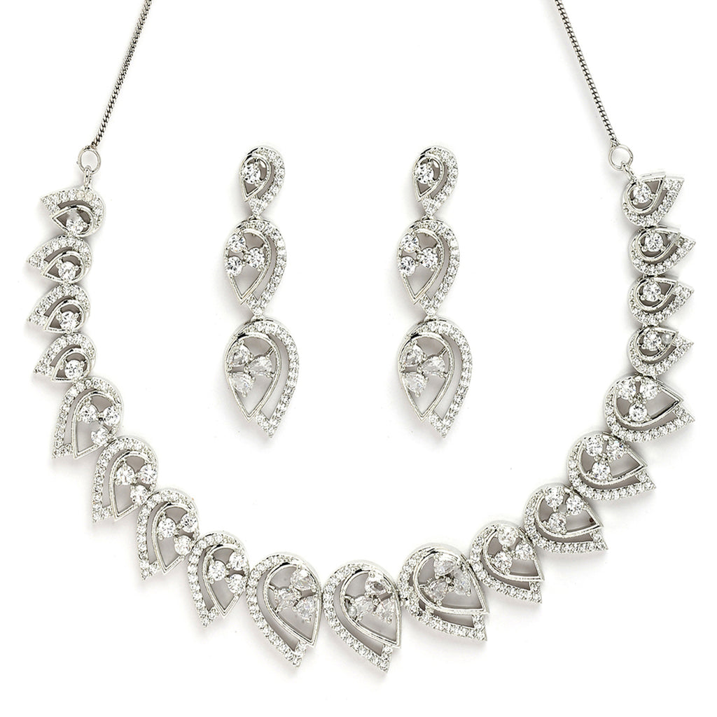 Elegant Motif Leaf Design: This rhodium-plated necklace set features a graceful motif leaf design, studded with dazzling white American diamonds for a timeless aesthetic.