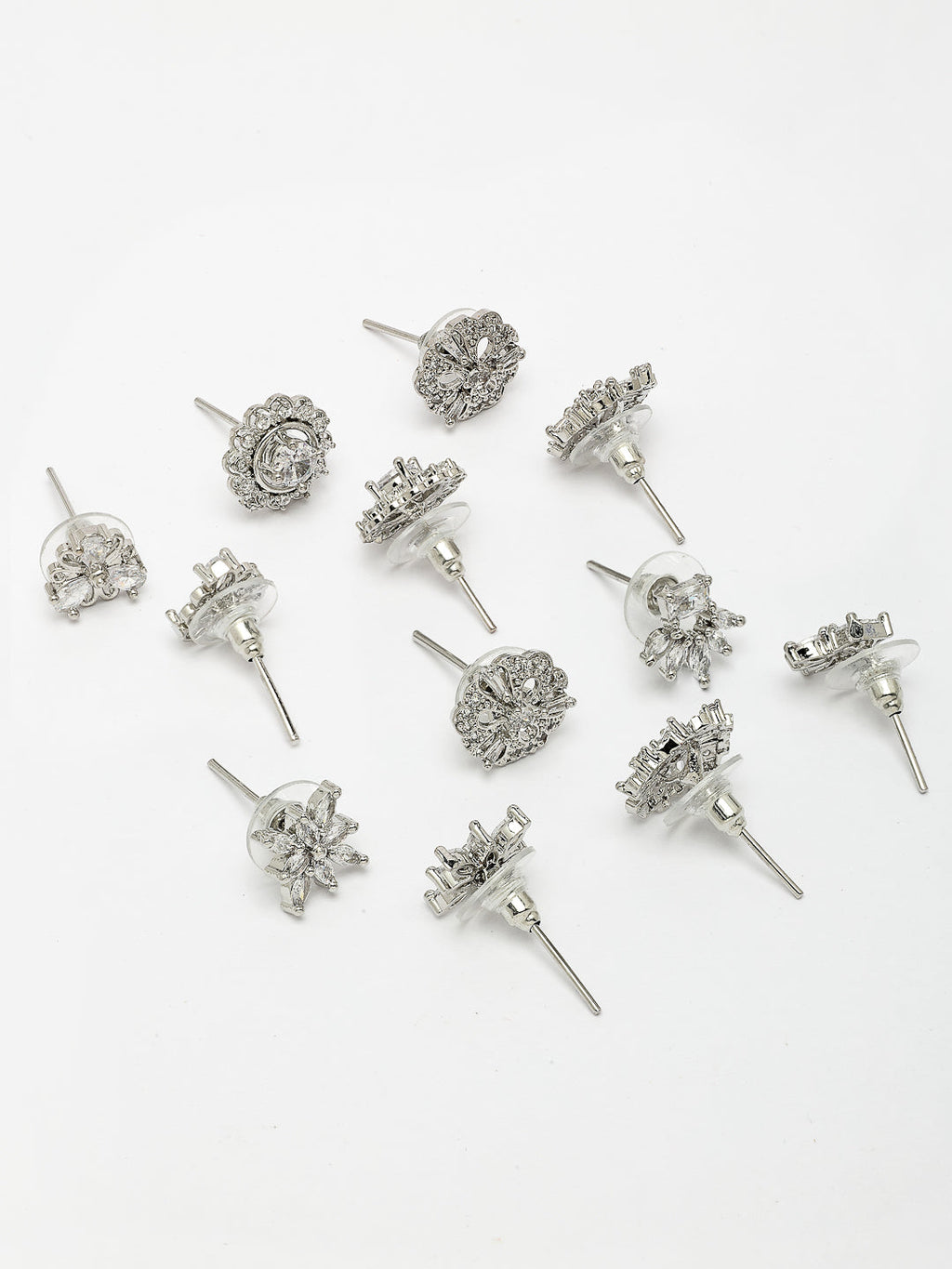 Rhodium Plated with White American Diamonds Studded Combo Set of 6 Stud Earrings