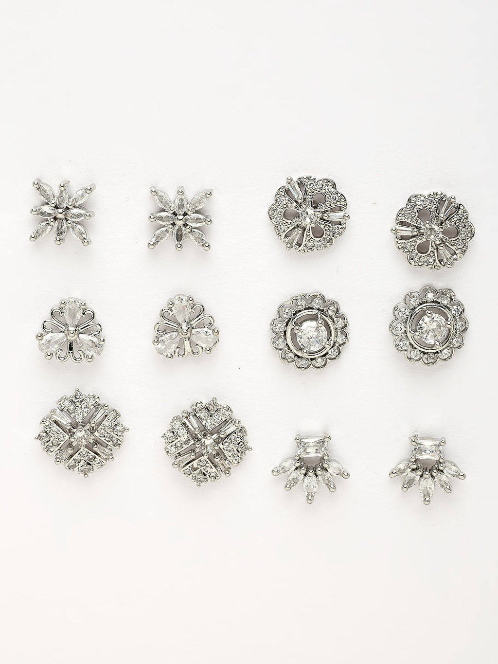 • Stylish Variety: This rhodium-plated combo set includes six pairs of earrings, each featuring a unique design and shape, ensuring a versatile collection for every occasion.