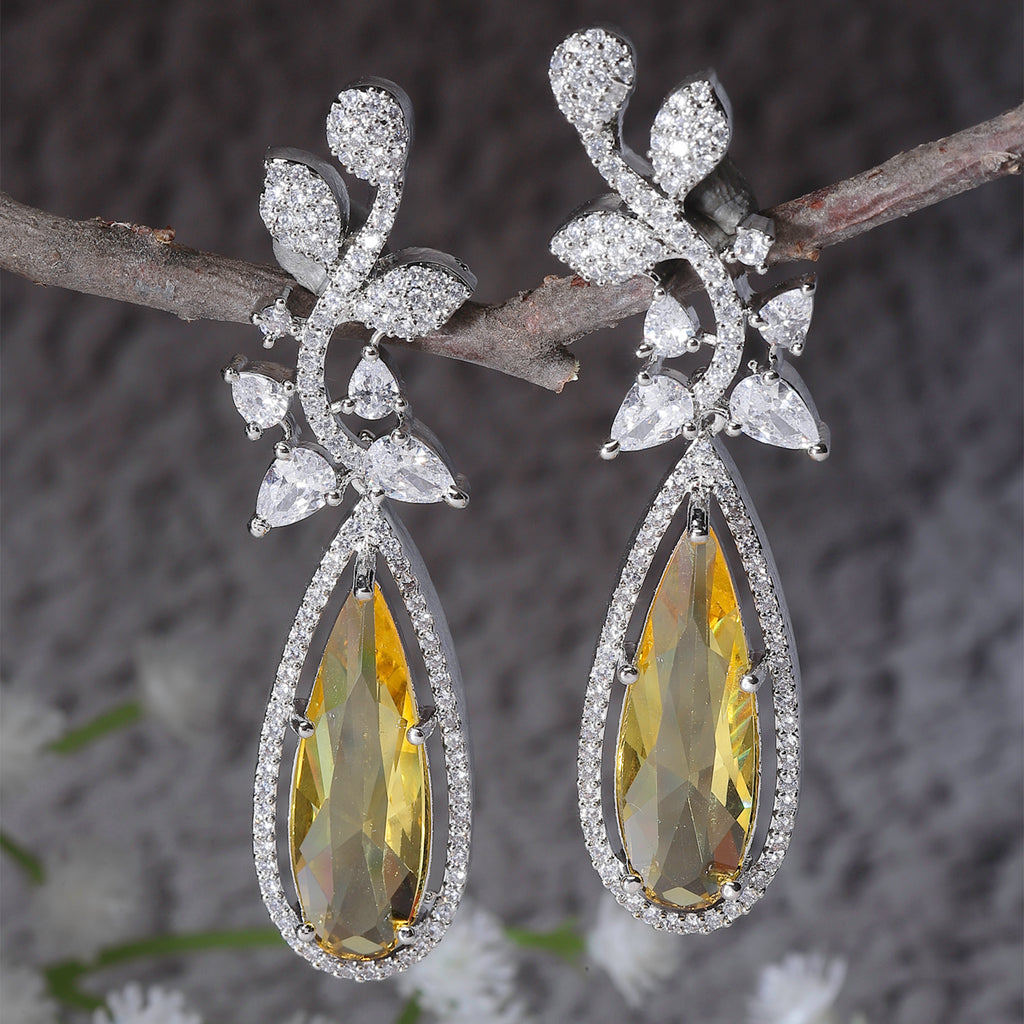 Rhodium-Plated with Silver-Toned Yellow & White Teardrop & Leaf Shaped Drop Earrings, has American Diamond studded secured with a post and back.