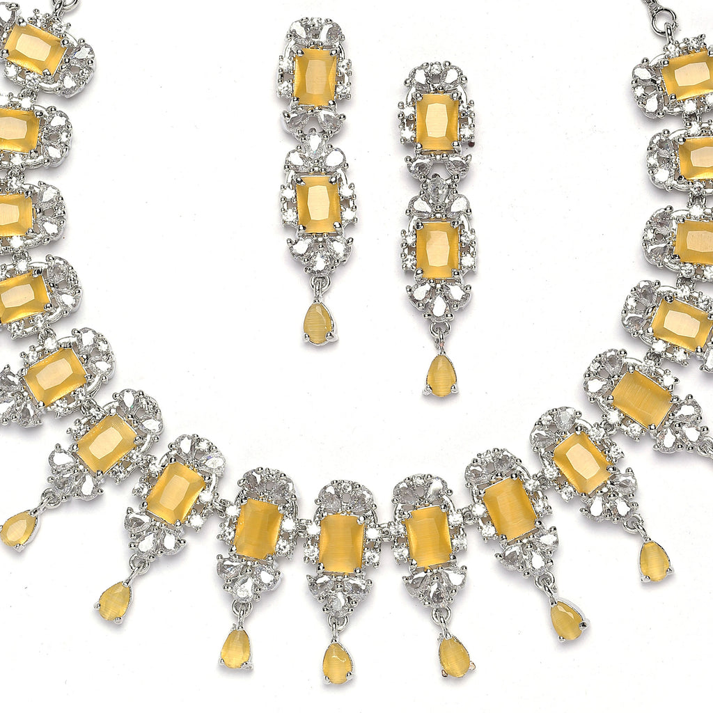 Rhodium-Plated Yellow American Diamonds Studded Teardrop & Cubical Necklace & Earrings Jewellery Set