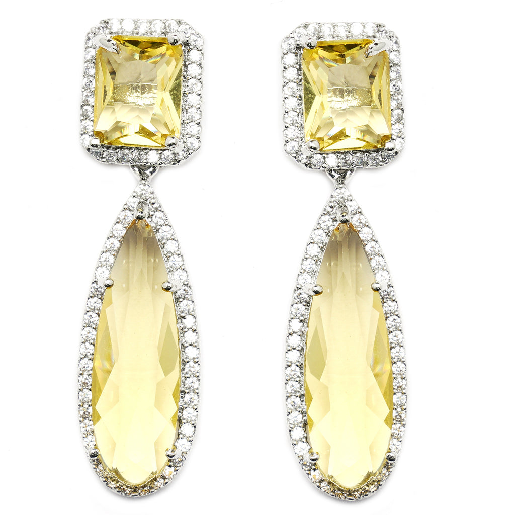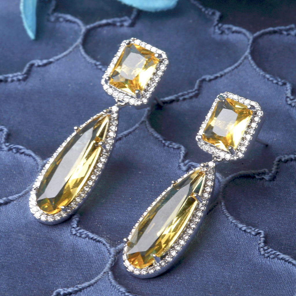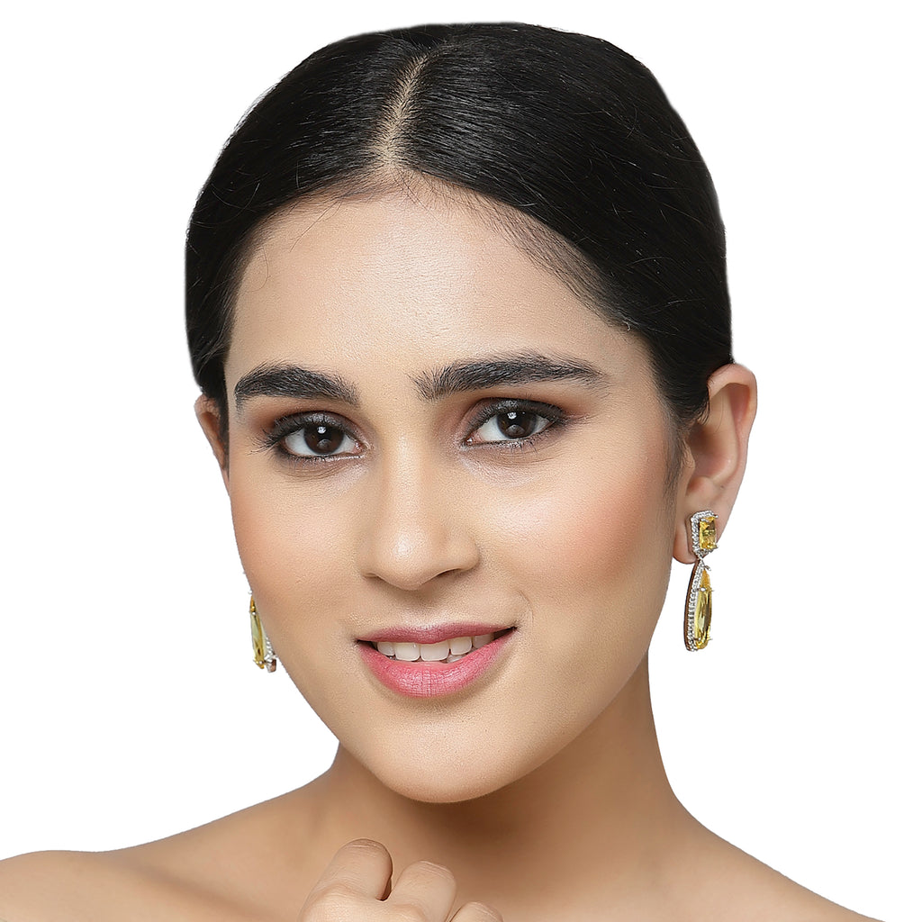 Rhodium-Plated Yellow & White Teardrop Shaped Drop Earrings, has American Diamond studded secured with a post and back.