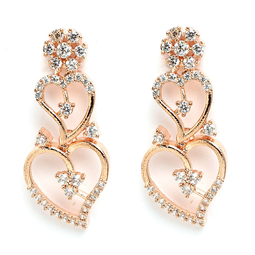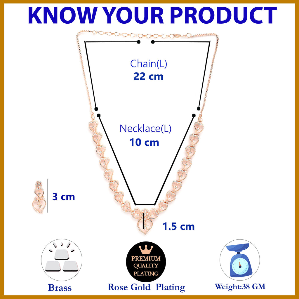 Elegant Design: Rose gold-plated necklace set featuring a cascading hearts design, beautifully adorned with white American diamond stones for a sparkling look.