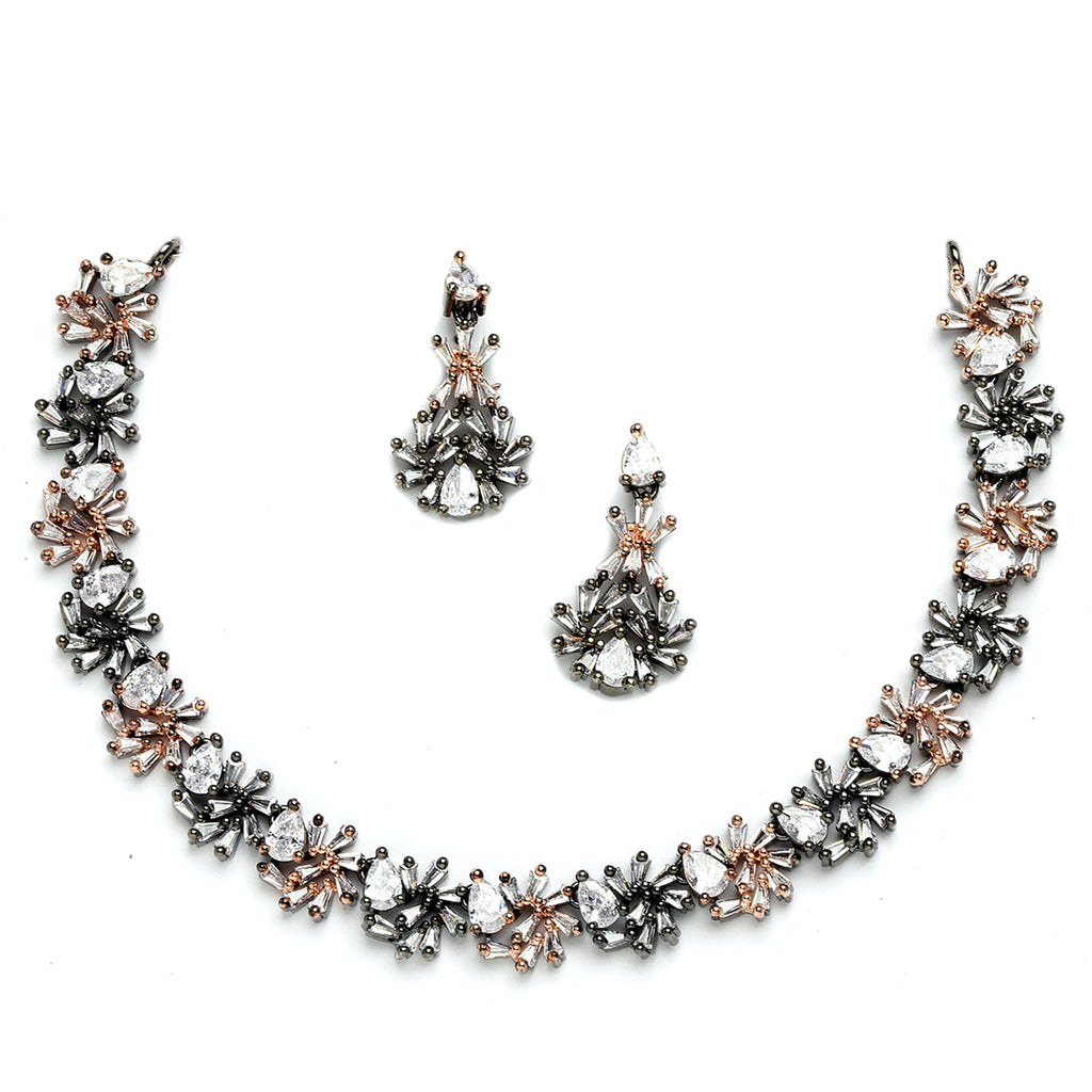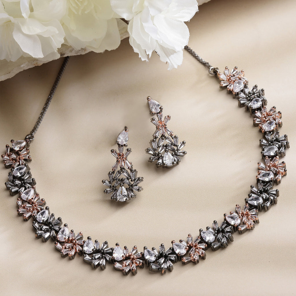 Rose Gold-Plated Floral and Pear Design Rose Black and White American Diamond Studded Jewellery Set