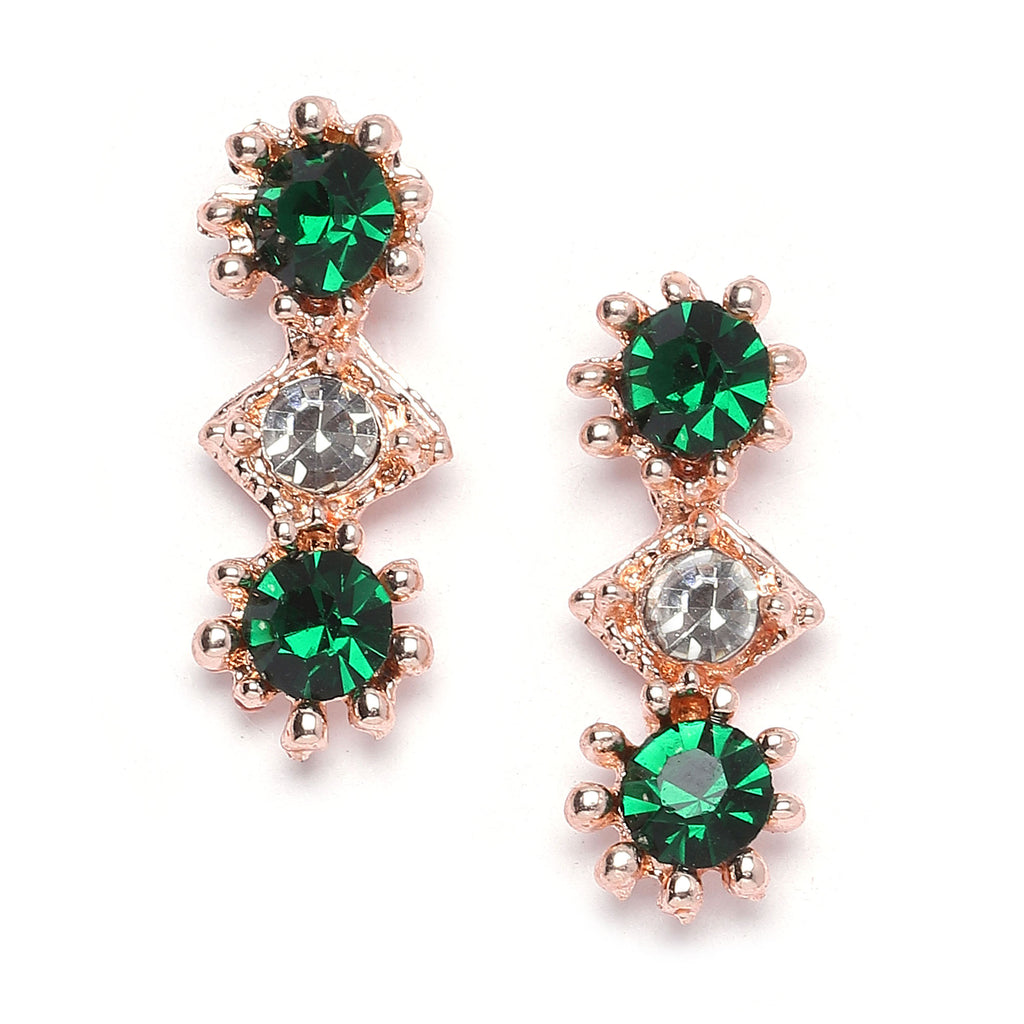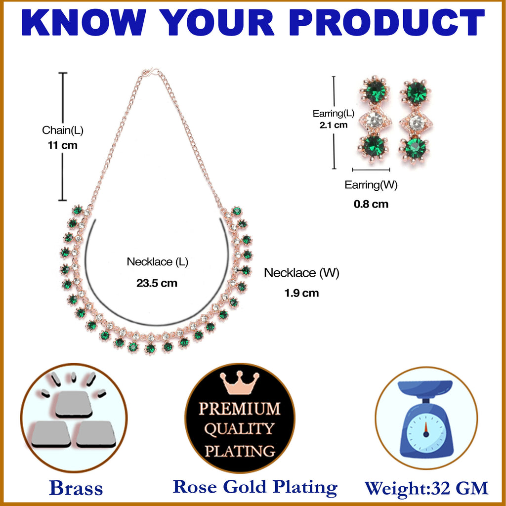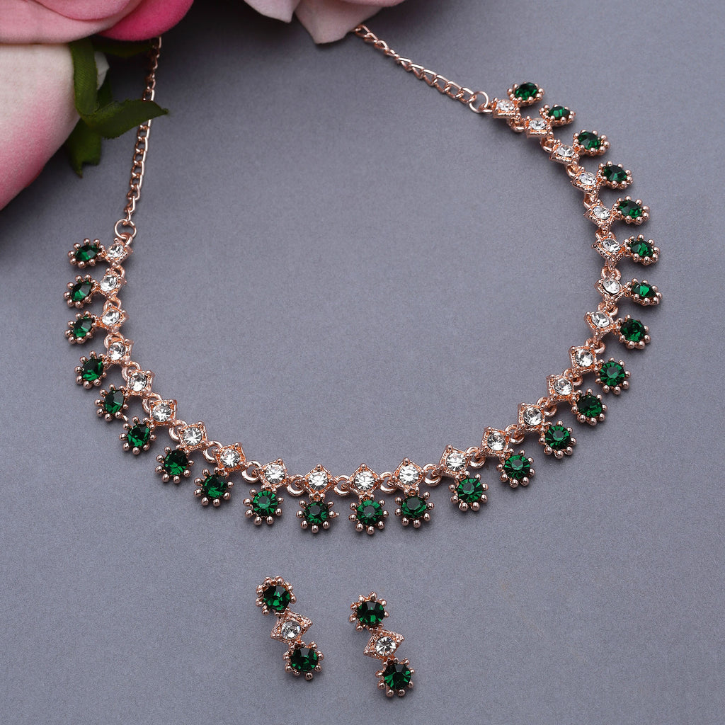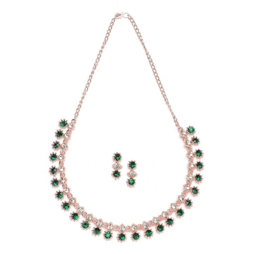 Rose Gold-Plated Green & White American Diamond Studded Star Shaped Necklace with Earrings Jewellery Set