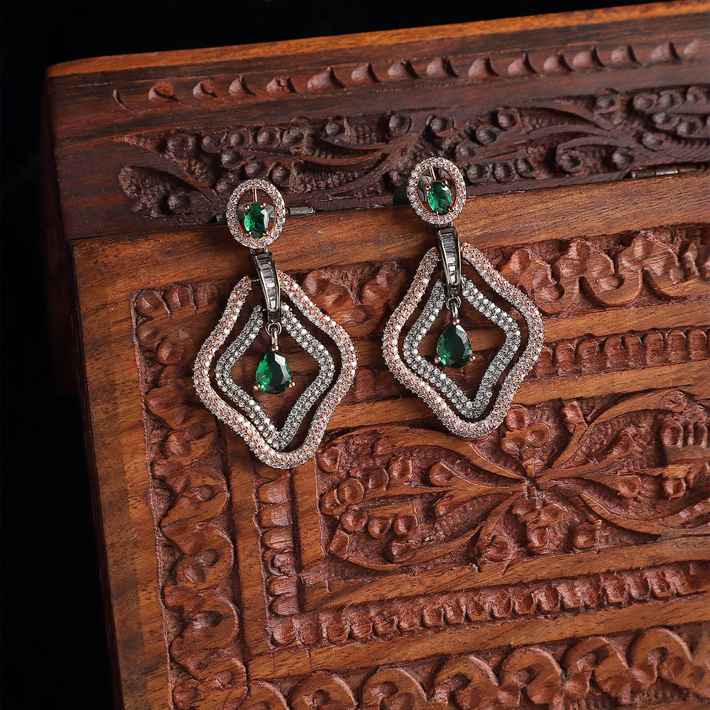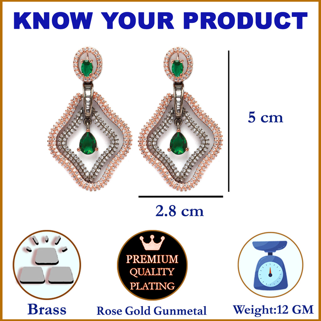 Rose Gold-Plated Gunmetal Toned Green American Diamond studded Layered Drop Earrings