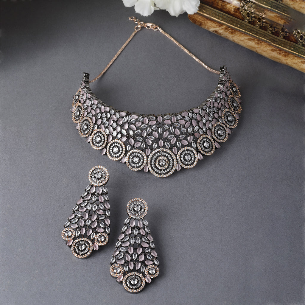 Rose Gold-Plated Gunmetal Toned Pink American Diamond Choker Necklace with Earrings Jewellery Set