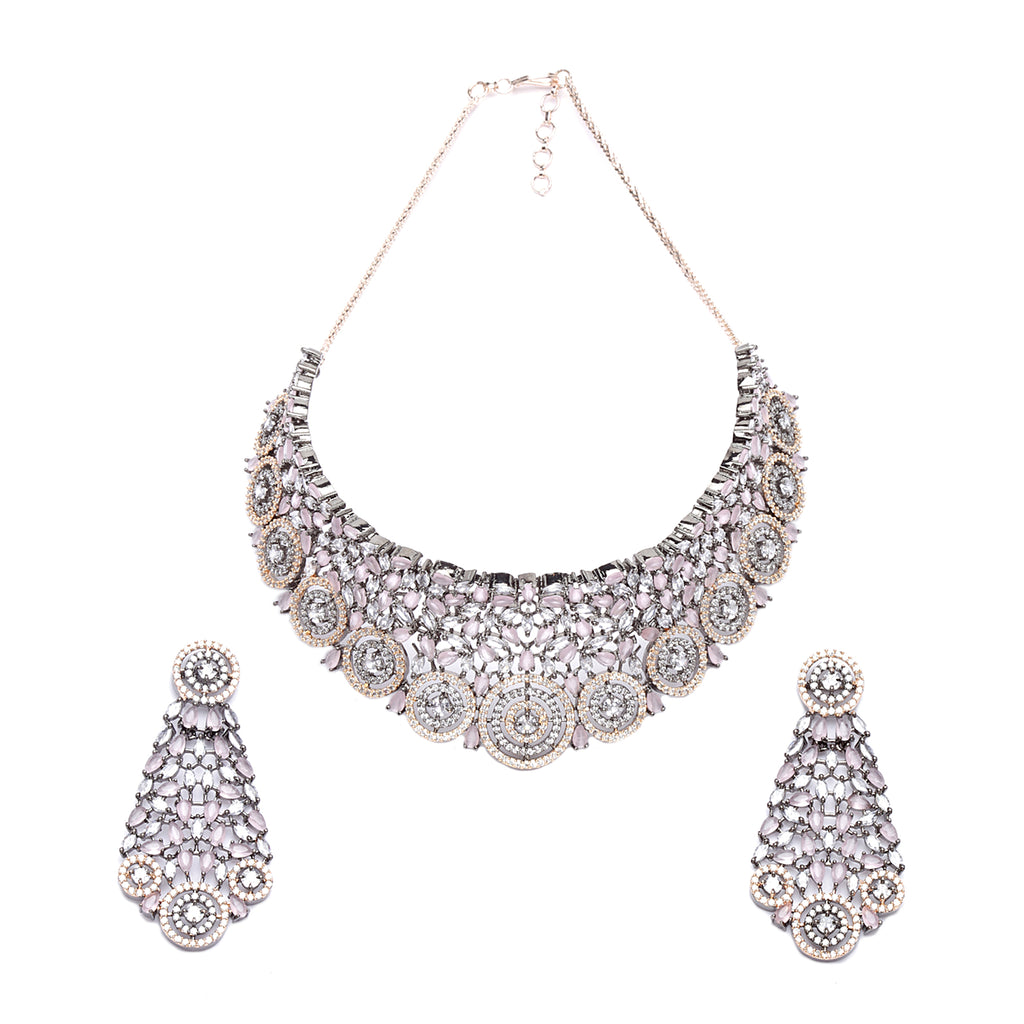 This jewellery set consists of a necklace and a pair of earrings. Rose Gold-Plated Gunmetal Toned pink and white american diamond studded choker necklace, has secured with hook closure. A pair of matching drop earrings, each secured with a post and back closure.