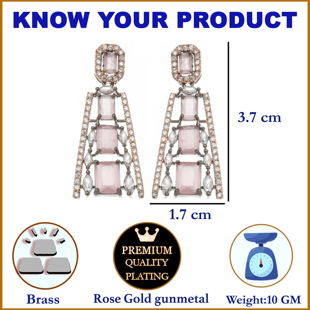 Rose Gold-Plated Gunmetal Toned Pink and White Contemporary Drop Earrings, has American Diamond studded secured with a post and back.