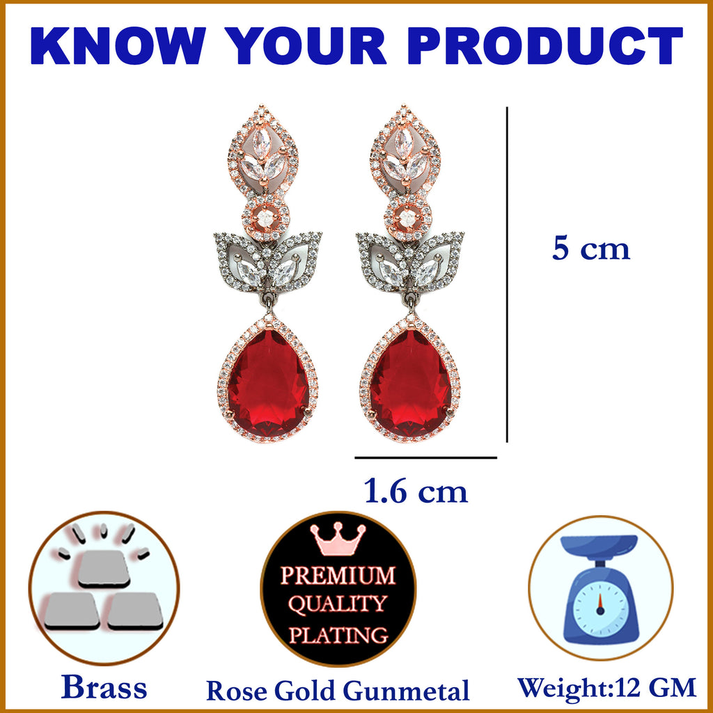 Rose Gold-Plated Gunmetal Toned Red American Diamond studded Teardrop & Leaf Shaped Drop Earrings