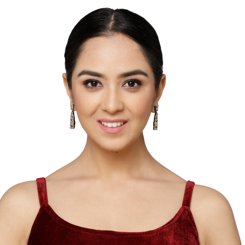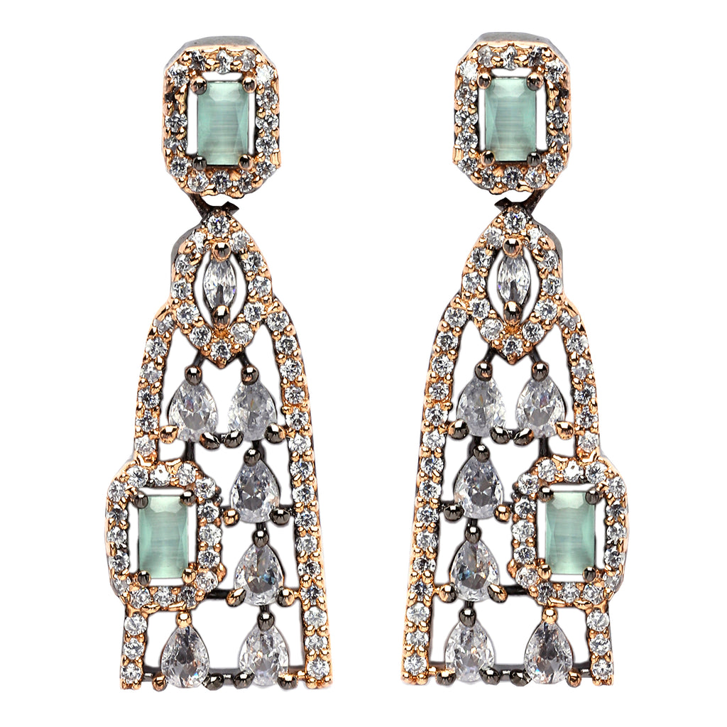 Rose Gold-Plated Gunmetal Toned Sea Green and White Classic Drop Earrings, has American Diamond studded secured with a post and back.