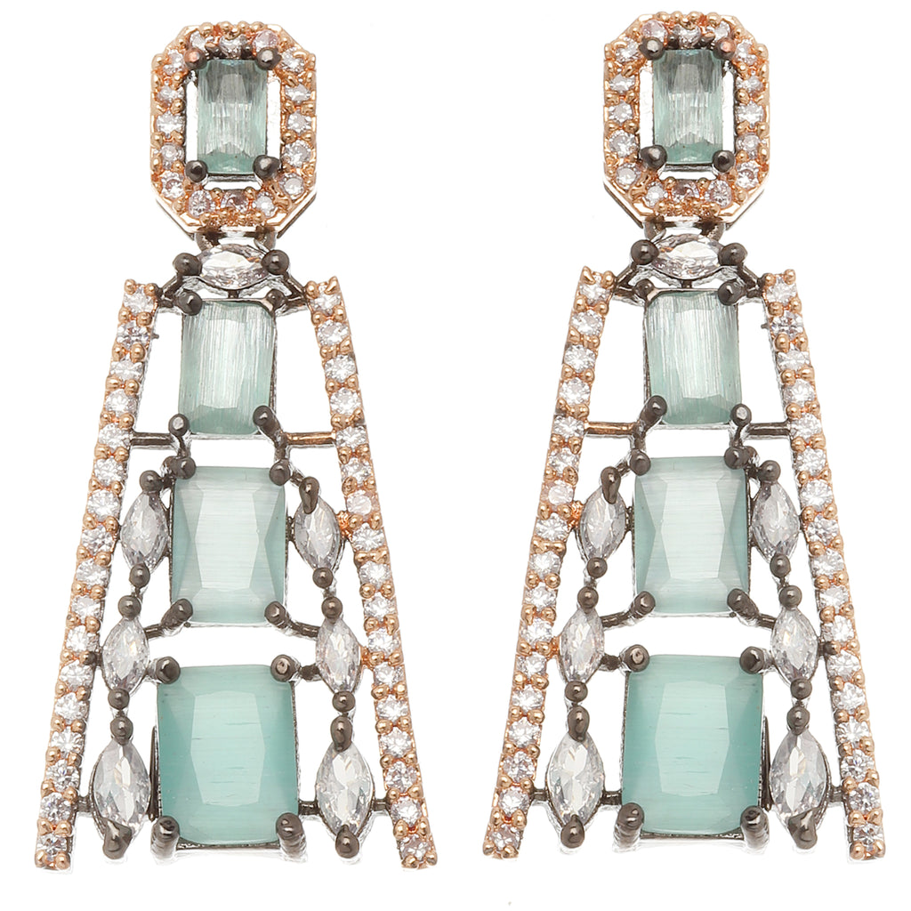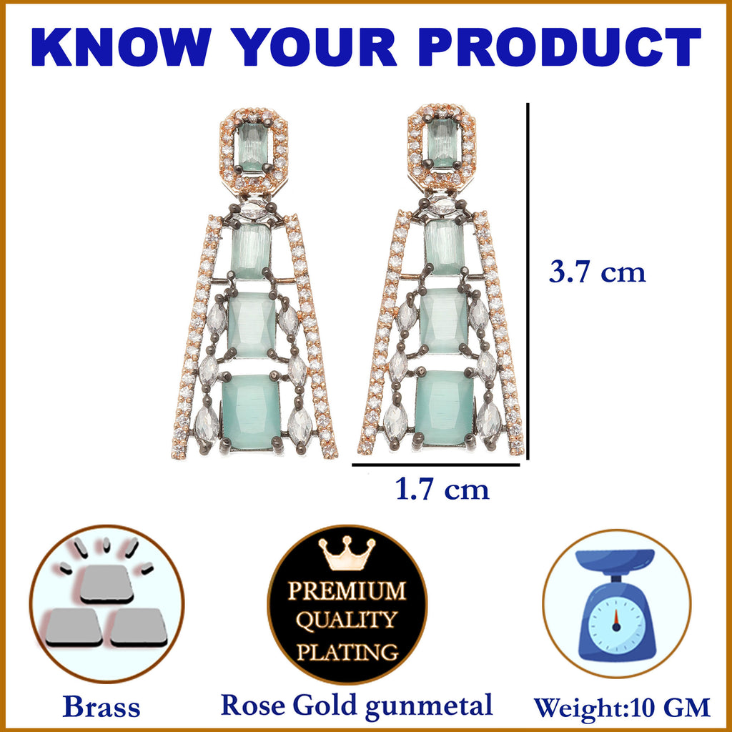 Rose Gold-Plated Gunmetal Toned Sea Green and White Contemporary Drop Earrings, has American Diamond studded secured with a post and back.