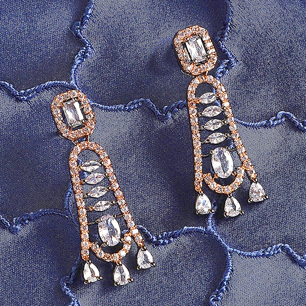 Rose Gold-Plated Gunmetal Toned White Classic Contemporary Drop Earrings, has American Diamond studded secured with a post and back.