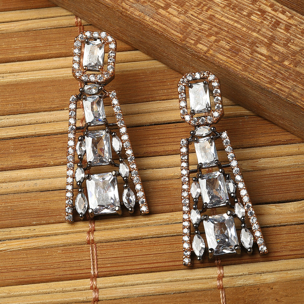Rose Gold-Plated Gunmetal Toned White American Diamond studded Contemporary Drop Earrings