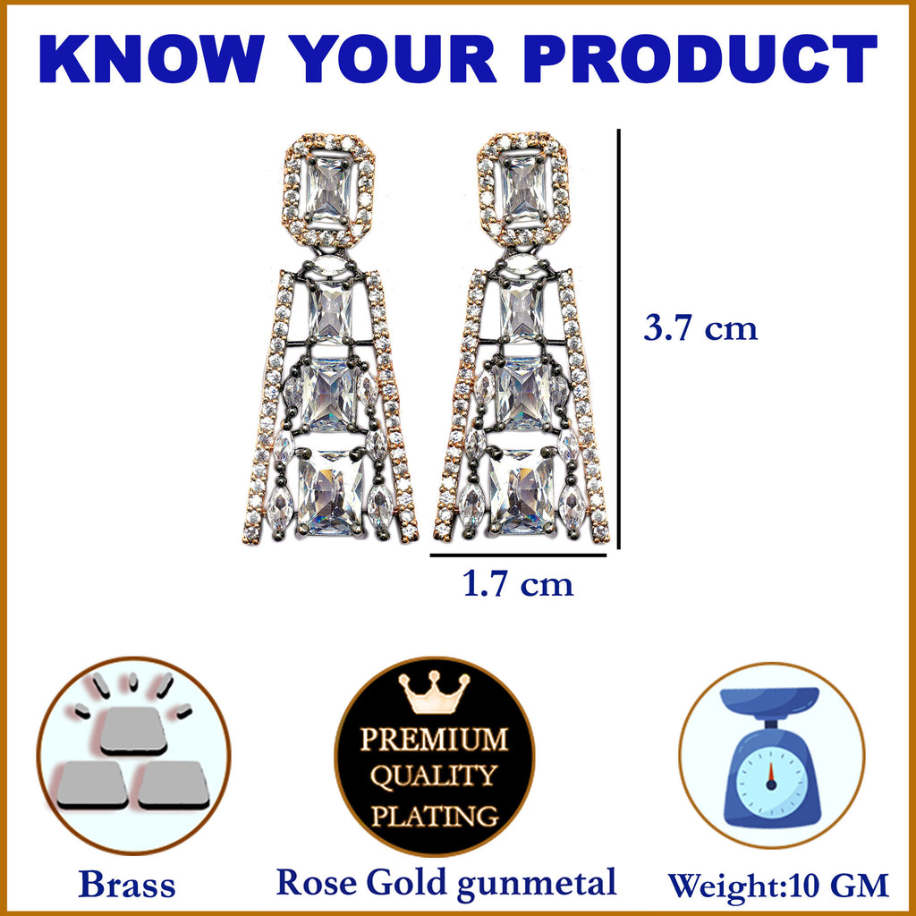 Rose Gold-Plated Gunmetal Toned White Contemporary Drop Earrings, has American Diamond studded secured with a post and back.