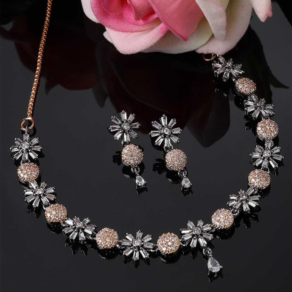 Rose Gold-Plated Gunmetal Toned White American Diamond Studded Flower-Round Necklace with Earrings Jewellery Set
