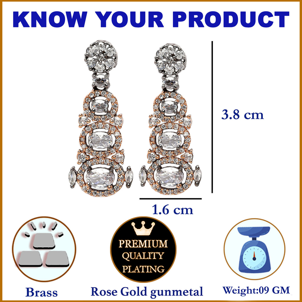 Rose Gold-Plated Gunmetal Toned White American Diamond studded Quirky Shaped Drop Earrings