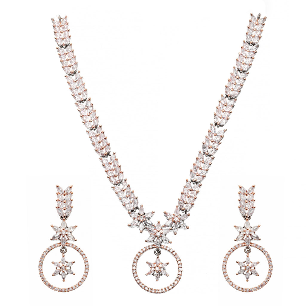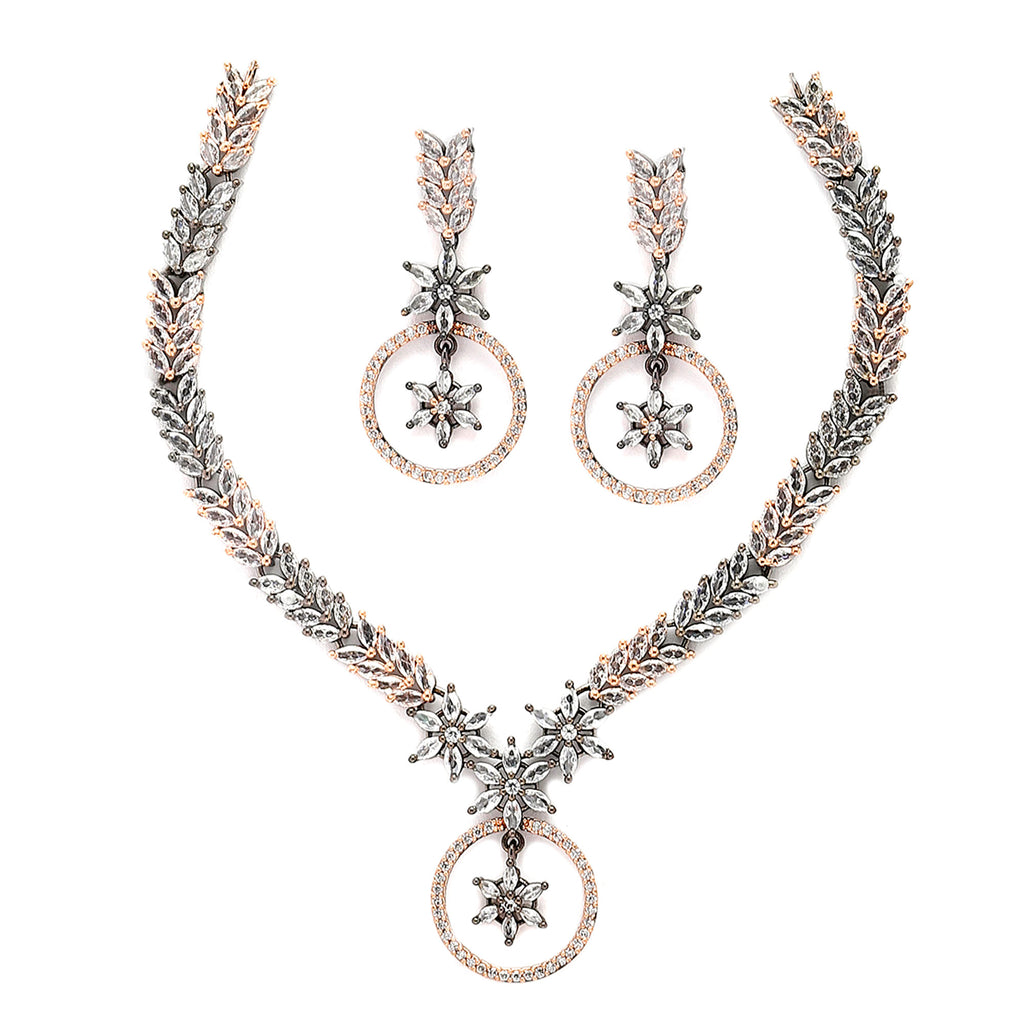 This jewellery set consists of a necklace and a pair of earrings. Rose Gold-Plated Gunmetal Toned white american diamond studded star & leaf shaped collar necklace, has secured with a s-hook closure. A pair of matching drop earrings, each secured with a post and back closure.